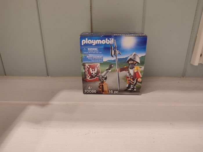 70086 playmobil œuf de Pâques produit dans son emballage d'origine scellé Ce set contient 1 personnage, 1 canon, 2 projectiles, 1 support pour les projectiles et des accessoires (épée, lance, casque).