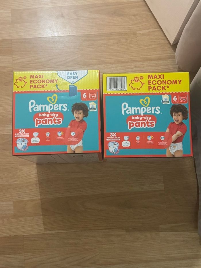 Je vends 2 paquets de couches Pampers Baby-Dry Pants, taille 6, en Maxi Economy Pack. Produits neufs, jamais ouverts. Très bonne protection, faciles à enfiler, idéales pour bébé.