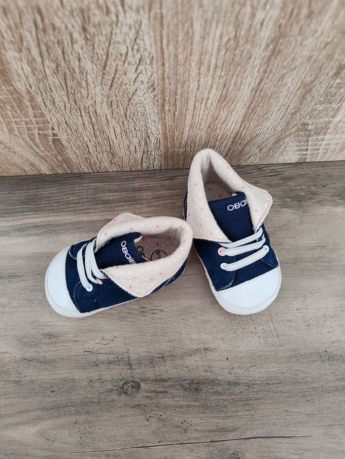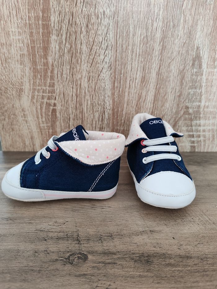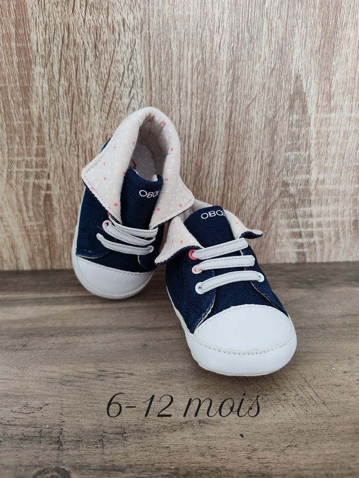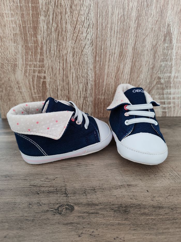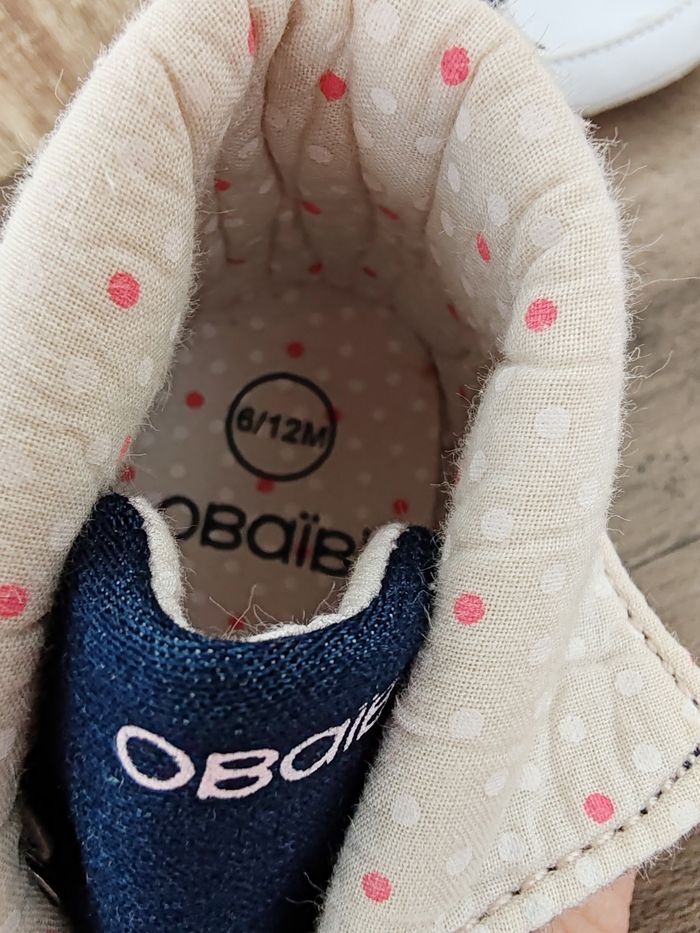 Baskets montante en jean foncé, avec revers beige à pois. Obaïbi, taille 6/12 mois, très bon état.