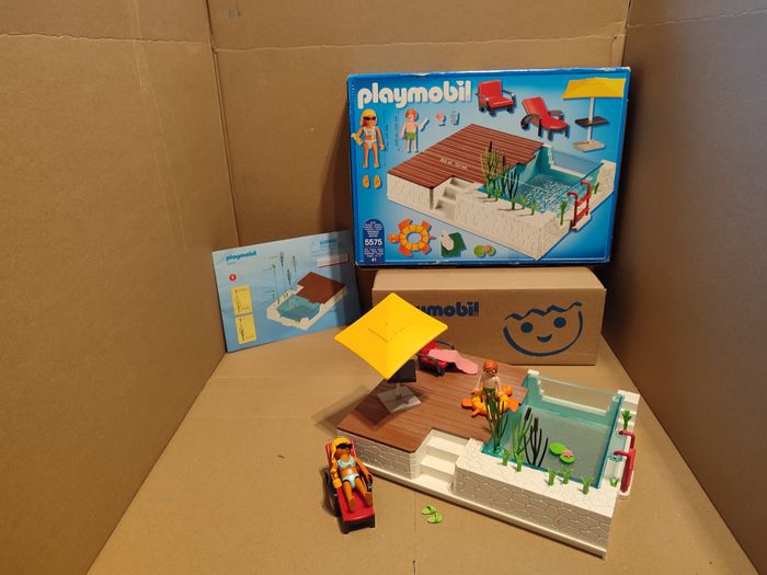 5575 playmobil city life d'occasion vendu avec la boite légèrement abimée et la notice de montage. La piscine avec terrasse contient deux personnages et de nombreux accessoires (parasol, bouée, plantes, échelle, chaises…)