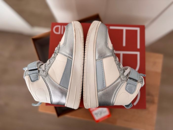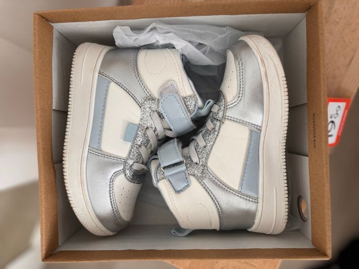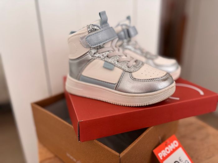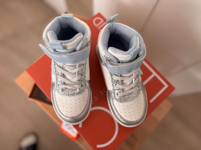 Vends jolies baskets montantes pour enfant, coloris blanc, argenté et bleu clair avec détails brillants. Pointure 26, convient également pour un 25. Chaussures confortables, avec lacets + scratch pour un bon maintien. Très bon état général (voir photos). Idéales pour le quotidien ou l’école. Envoi rapide ! ‼️Photo et vidéo de l’emballage avant envoi ‼️ N’hésitez pas à regarder le dressing ☺️