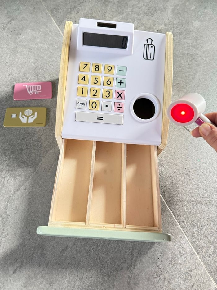 Caisse enregistreuse en bois, avec tiroir et scanette lumineuse et 2 cartes bancaires en bois également.