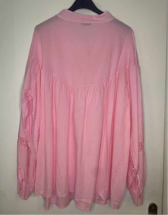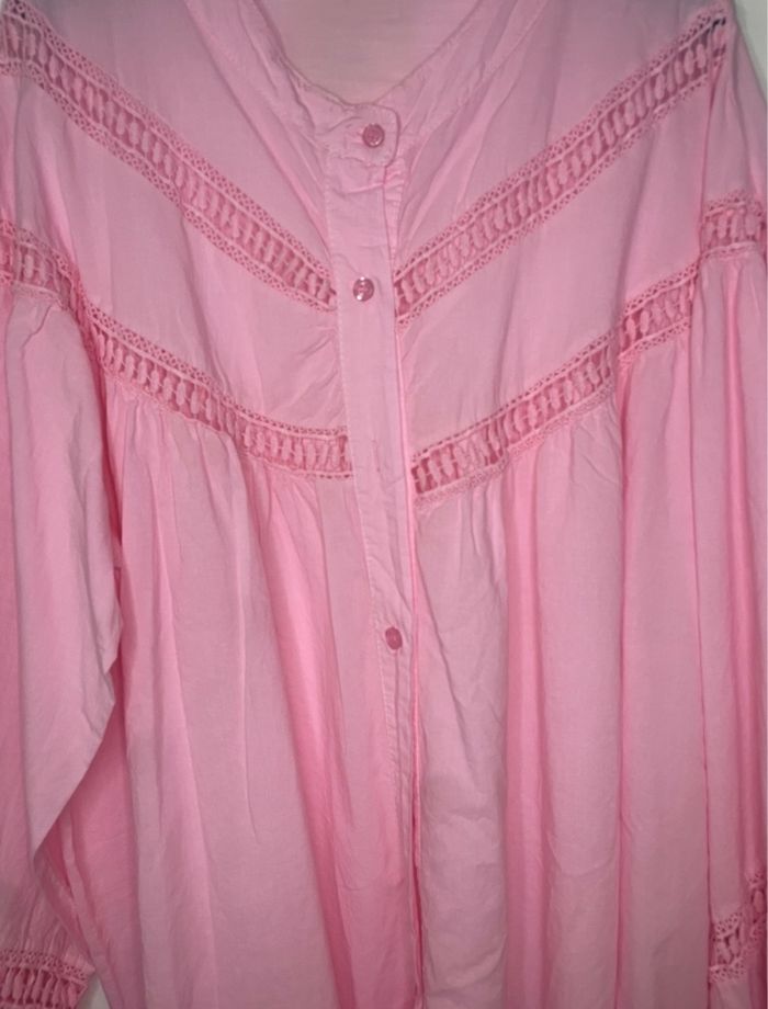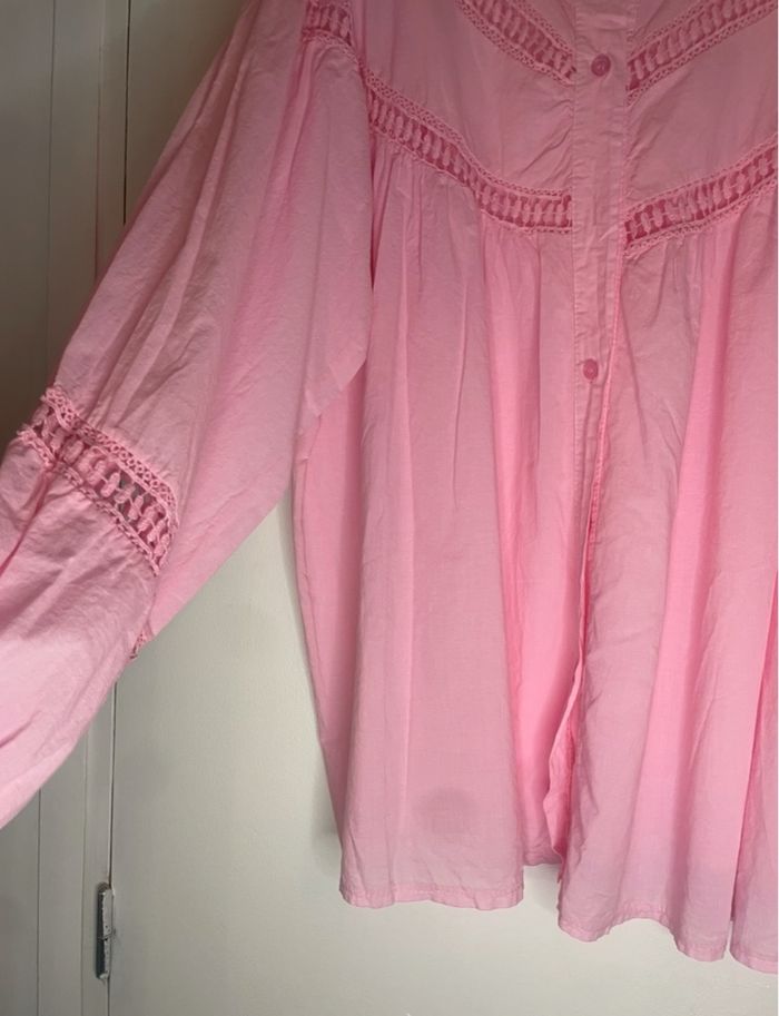 Magnifique chemise en voile de coton rose , col rond, manches longues légèrement bouffantes Taille unique qui va du 44 au 50 Largueur sous aisselles 68 cms