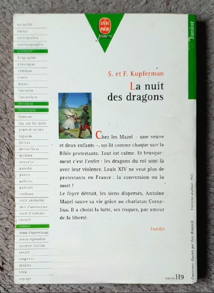 Résumé : Chez les Mazel, comme tous les soirs, on lit la Bible protestante. Mais brusquement, les Dragons du Roi Louis XIV font irruption avec toute leur violence. Le Roi ne veut plus de protestants en France : C'est la conversion ou la mort! Le jeune Antoine réussira-t-il à s'échapper ? Accompagné de l'étrange Cornelius, jusqu'où le conduira sa lutte pour la liberté ?.. Année de parution : 1996. Auteurs : Sigrid et Fred Kupferman. Illustrateur : Yves Beaujard. Collection : Le Livre de Poche Jeunesse N°236. Éditions : Hachette Jeunesse. =) En très bon état général! Juste de très légères traces d'usage sur couverture (minimes). L'intérieur est très propre.