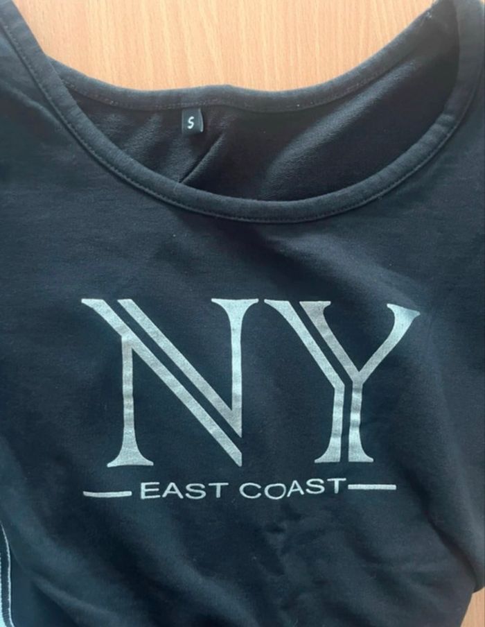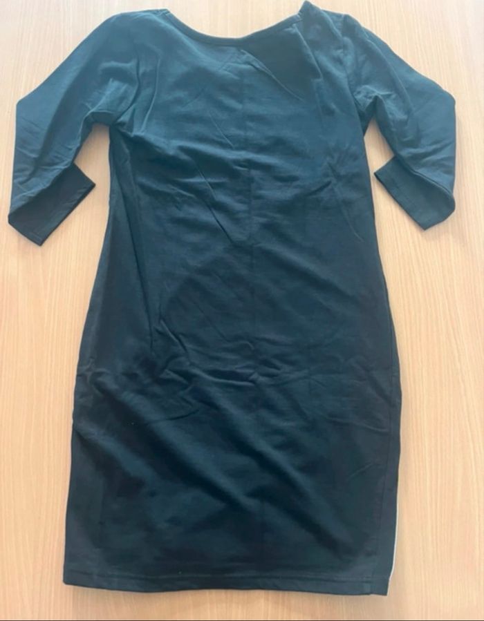robe noir avec deux bandes bleu blanc et argentée de chaque côté, manche mi longue, épaisse, en très bon état, taille S, sans marque.