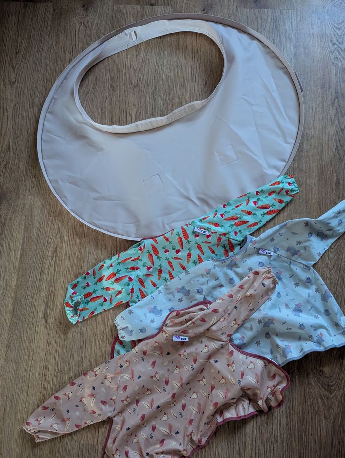 Autres articles vnted dispo pseudo arnma Valeur neuve : 70 euros plateau + 2 bavoir + 1 bavoir à 17 euros soit 87 euros. Idéal DME. Très bon état. Le plateau est en très bon état. Le scratch est un peu teinté mais 100% propre (nettoyé, javellisé). Le bavoir carotte est comme neuf. Les deux autres sont propres mais conserves quelques tâches de feutre. Cf photo Les 3 bavoirs sont vendus avec la protection du scratch permettant de les laver en machine sans qu'ils abîment d'autres tissus. Le plateau est vendu avec sa pochette de rangement et la mini notice pour les ventouses.