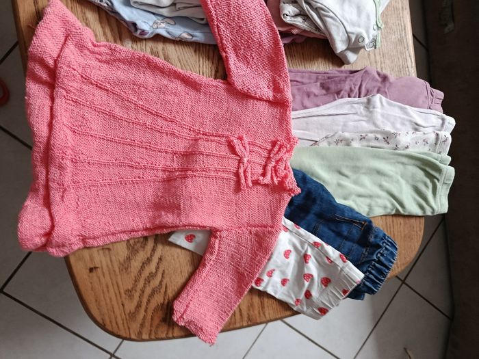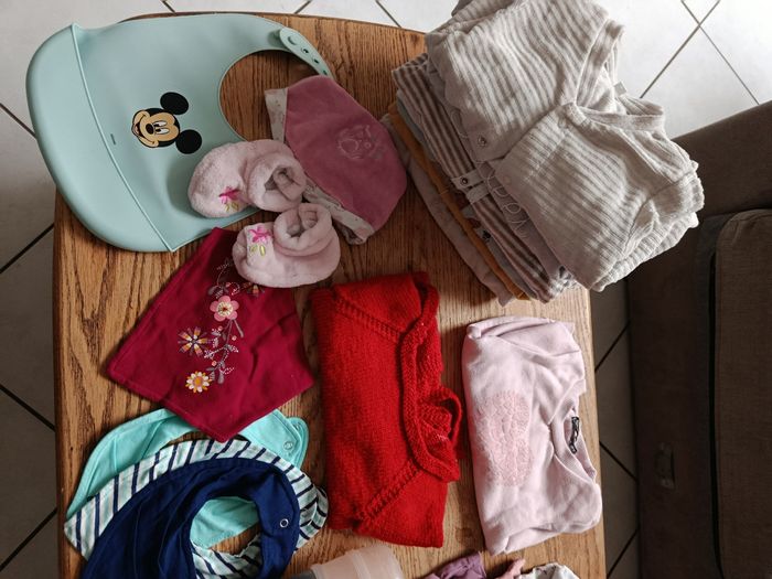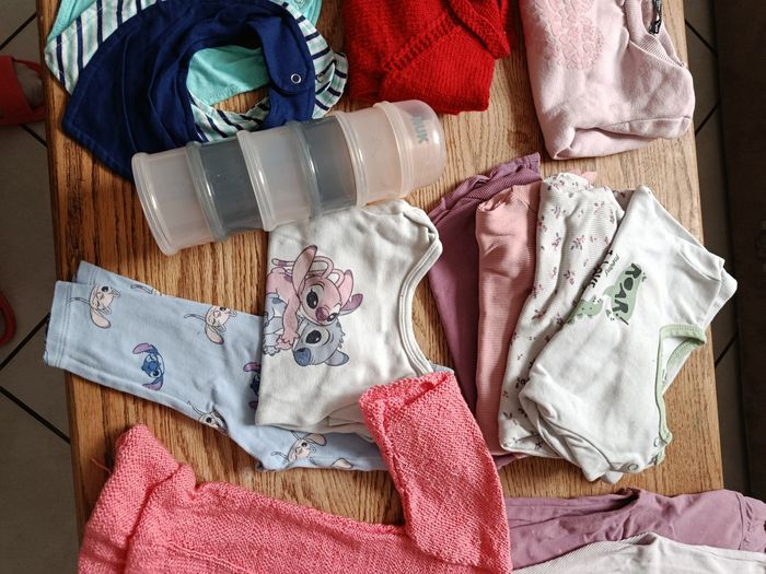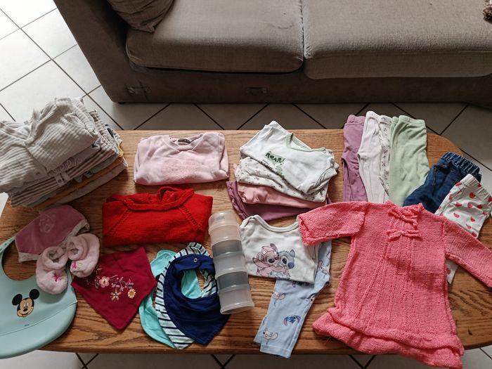 A vendre lot fille 9 mois 25 pièces composé : - 1 bavoir en silicone - 1 bonnet - 1 paire de chaussons - 7 pyjamas - 4 bavoirs - 1 pull en laine fait main - 1 sweet - 1 boîte de conservation lait 6 compartiment NUK - 1 ensemble STITCH (body + legging) - 4 ensemble (haut + legging) - 1 robe en laine fait main - 1 jean - 1 legging Diverses marques : NUK, IN EXTENSO, KIABI, DISNEY Parfait état et lavé