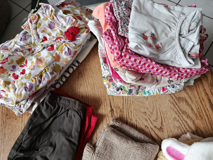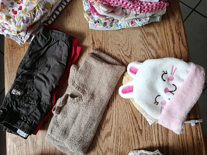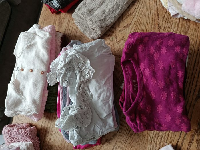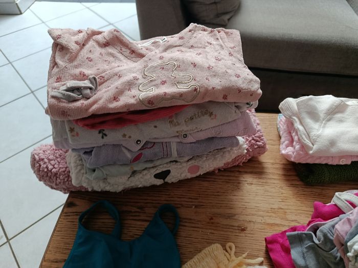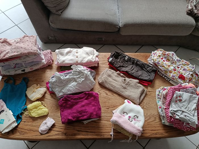 A vendre lot fille 6 mois 53 pièces composé : - 6 pyjamas - 1 maillot de bain - 2 paires de collants NEUF EMBALLÉS - 1 bavoir - 7 bonnets - 2 paires de chaussons - 1 paire de gants - 5 bodys manches longues - 9 bodys manches courtes - 3 gilets - 2 pantalons - 1 pull - 9 robes - 4 ensembles (legging/short + haut) Diverses marques : Lulu Castagnette, Kiabi, C&A, In extenso, fait main, Jacadi, Gémo, Mes petits cailloux, ... Parfait état