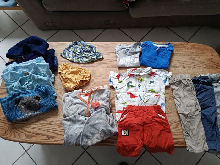 Lot 9 mois garçon 15 pièces composé : - 4 gilets - 1 bob - 1 slip de bain - 2 pyjamas - 2 tee shirts - 1 chemise manches courtes - 1 short - 3 pantalons Diverses marques : C&A ORCHESTRA TEX MOTS D'ENFANTS ZEEMAN TISSAIA KIMBALOO BOITE A MALICE Très bon état
