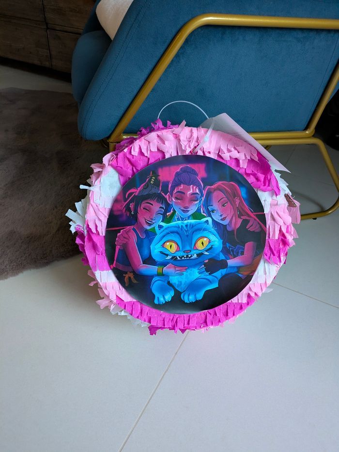 Grande pinata derpy chat tigre K-pop demon hunter huntrix kpop chanteuse Dimensions : 35 cm de diamètre et 15 cm de large Recto-verso identique