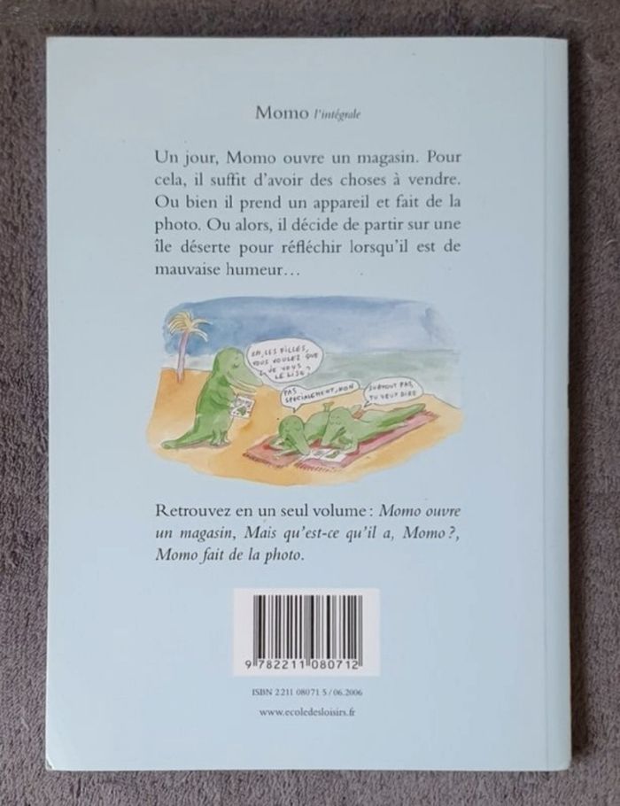 Descriptif : TOUT MOMO DANS UN SEUL LIVRE! Enfin, voici les trois Histoires de ce Dinosaure-Alligator au fichu caractère : «Momo fait de la photo», «Momo ouvre un magasin» et «Mais qu'est-ce qu'il a Momo ?» Date de parution : 06/2006. Auteur & Illustratrice : Nadja. Collection : Animax. Éditions : L'École des Loisirs. Dimensions du livre : 12.5×18.9Cm. =) 96 pages. Montant d'achat magasin : 10E. État neuf.