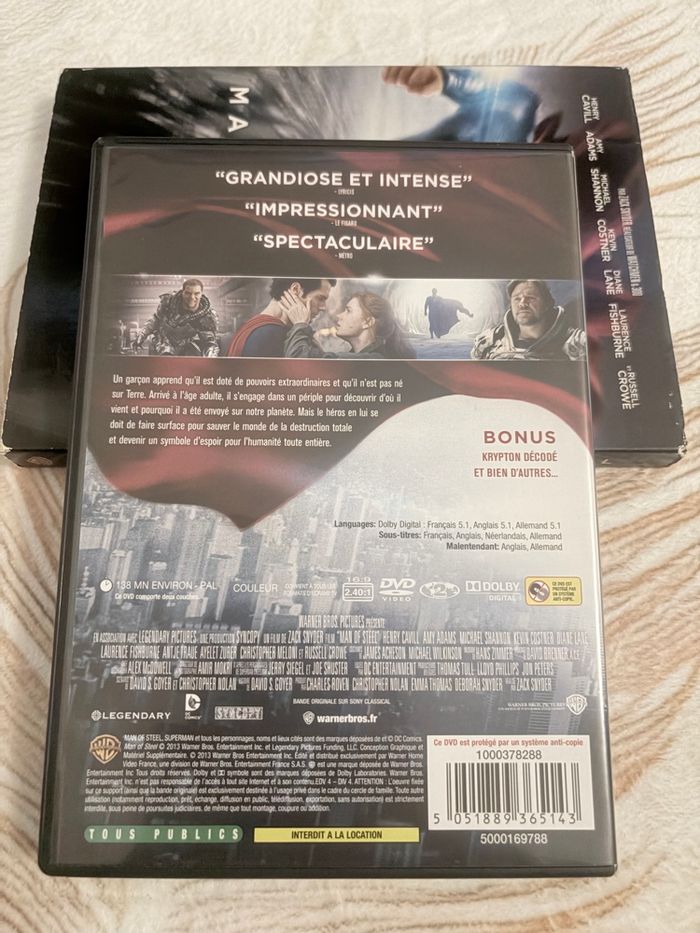 Ce film culte de Zack Snyder marque le renouveau de Superman à l'écran. Porté par Henry Cavill, ce long-métrage spectaculaire explore les origines du super-héros avec une intensité rare. L'édition comprend le boîtier DVD standard ainsi que son fourreau cartonné illustré. ⚖️ Conditions de vente et Litiges • État : L'article est d'occasion. Des marques d'usure sont visibles sur les bords du fourreau cartonné (voir photos). Le disque est en excellent état. • Photos : Les photos font partie intégrante de la description. 📏 Mesures à plat • Format boîtier : Env. 19 cm x 13,5 cm. 🔍 Caractéristiques • Marque : Warner Bros / DC Comics. • Durée : Env. 138 minutes. • Public : Tous publics. • Langues : Français, Anglais, Allemand (Sous-titres : Français, Anglais, Néerlandais, Allemand). • Taille : Édition 1 DVD. • État : Bon état (boîtier/disque). Fourreau : État correct (usures aux angles). 💰 Informations de vente • Prix : 3,00 € #PimpTaFrip_Multimedia #PimpTaFrip_DVD #Superman #ManOfSteel #DCComics #Cinema Je reste disponible pour toute question, n’hésitez pas à me contacter.