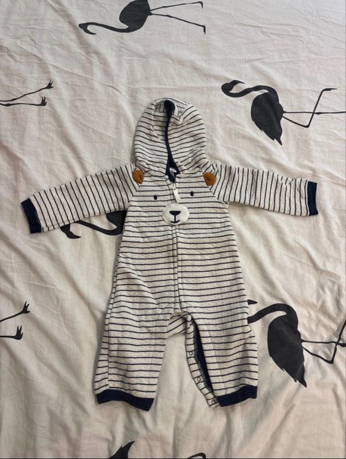 Parfait état 12M 74cm Combinaison longue en double jersey rembourré. Capuche et Ouverture zippée à l'avant.
