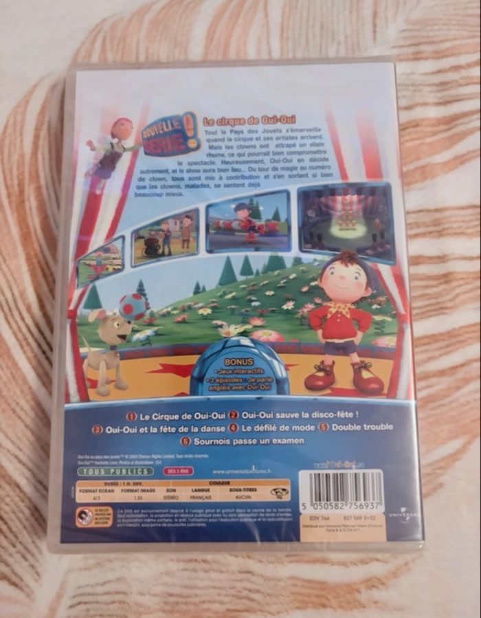 Ce DVD intitulé Le cirque de Oui-Oui propose une aventure magique au Pays des Jouets. Lorsque les artistes du cirque tombent malades, Oui-Oui et ses amis se mobilisent pour que le spectacle ait lieu malgré tout. Ce volume contient 6 épisodes colorés et éducatifs, parfaits pour les plus jeunes. 📋 Conditions de vente et Litiges Article proposé avec une totale transparence. Les photos font partie intégrante de la description. 📏 Détails des mesures • Format : Boîtier DVD standard • Durée : 1 heure environ • Public : Dès 3 ans (Tous publics) 💿 Matières et Entretien • Support : Disque DVD vidéo. • Langue : Français. • Épisodes inclus : Le Cirque de Oui-Oui, Oui-Oui sauve la disco-fête !, Oui-Oui et la fête de la danse, Le défilé de mode, Double trouble, Sournois passe un examen. • Bonus : Jeux interactifs + 2 épisodes "Je parle anglais avec Oui-Oui". ✨ Caractéristiques • Marque : Universal / Chorion • Taille : Unique • État : Neuf (Sous blister d'origine) 💰 Informations de vente • Prix : 4,00 € #PimpTaFrip_DVD #PimpTaFrip_Cinema #PimpTaFrip_Enfants #OuiOui #PaysDesJouets #DessinAnime #DVDEnfant #Jeunesse Je reste disponible pour toute question, n'hésitez pas à me contacter.