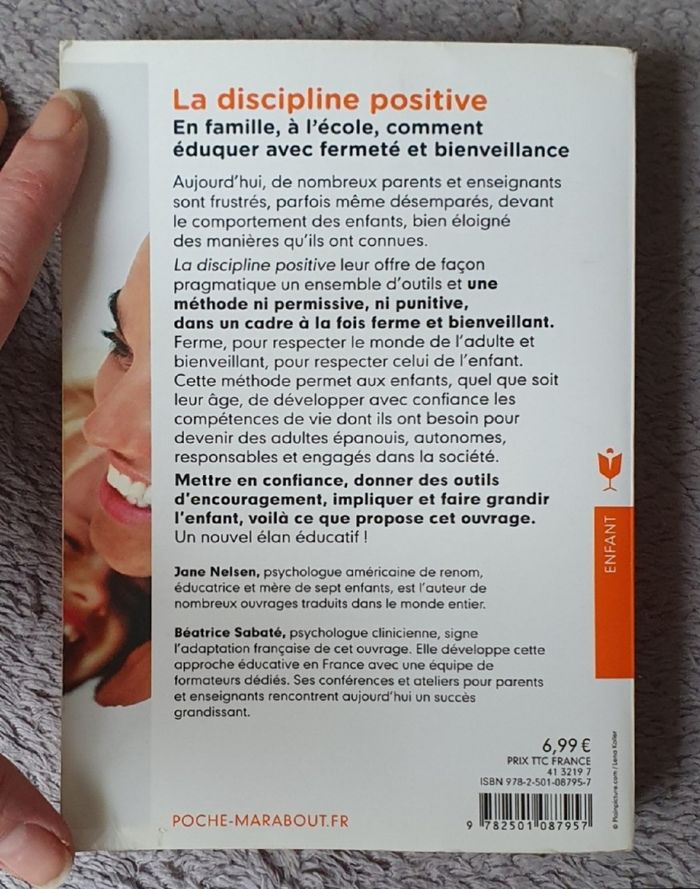 Descriptif : "Mettre en confiance, donner des outils d'encouragement, impliquer et faire grandir l'enfant : C'est ce que propose cet ouvrage à travers de nombreux cas pratiques du quotidien. Aujourd'hui, de nombreux parents et enseignants sont frustrés par le comportement des enfants, bien éloigné des manières qu'ils ont connues. L'ouvrage de Jane Nelsen leur offre des clés, des outils concrets ainsi qu'une méthode d'apprentissage ni permissive, ni punitive, dans un cadre à la fois ferme et bienveillant. Ferme, pour respecter le monde de l'adulte et bienveillant, pour respecter celui de l'enfant. Un nouvel élan éducatif! Cette méthode permet aux enfants, quel que soit leur âge, de développer avec confiance les compétences de vie dont ils ont besoin pour devenir des adultes épanouis, autonomes, responsables et engagés dans la société".. Date de parution : 27/08/2014. Auteur : Jane Nelsen. Traductrice : Sabaté Béatrice. Collection : Poche Marabout. Éditions : Marabout. =) 384 pages. Montant d'achat magasin : 6.99E. En très bon état général! Juste de très légères traces d'usage sur couverture (minimes). L'intérieur du livre est nickel!