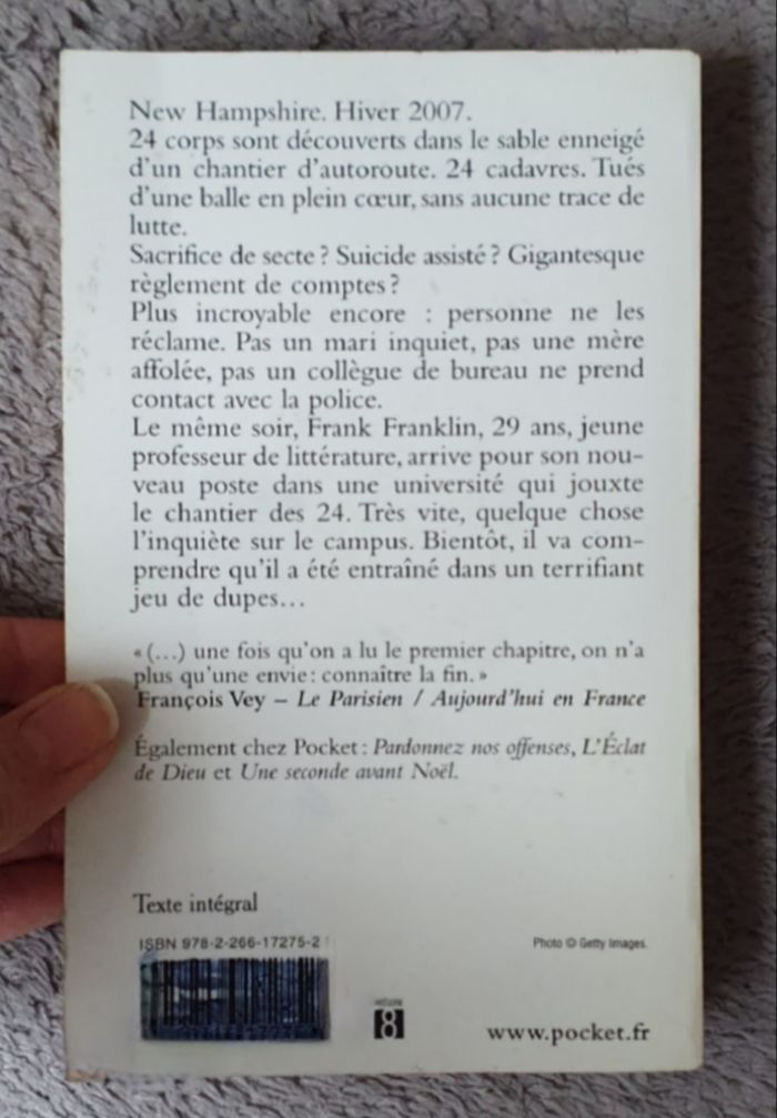 =) Roman policier & polar, thriller, suspense, policier historique, enquêtes, meurtre, tueur en série, manipulation, New Hampshire, université, scribe club, fbi, États-Unis.. Résumé : New Hampshire. 24 corps sont découverts dans le sable enneigé d'un chantier d'autoroute. 24 cadavres. Tués d'une balle en plein cœur, sans aucune trace de lutte. Plus incroyable encore : Personne ne les réclame. Le même soir, Frank Franklin, 29 ans, jeune professeur de littérature, arrive pour son nouveau poste dans une Université qui jouxte le chantier des 24. Très vite, quelque chose l'inquiète sur le campus. Bientôt, il va comprendre qu'il a été entraîné dans un terrifiant jeu de dupes... "Une fois qu'on a lu le premier chapitre, on n'a plus qu'une envie : Connaître la fin". François Vey. Le Parisien / Aujourd'hui en France. Date de parution : 03/01/2008. Auteur : Romain Sardou. Éditions : Pocket. =) 416 pages. En très bon état général. Juste de très légères traces d'usage sur couverture (minimes). L'intérieur du livre est nickel.
