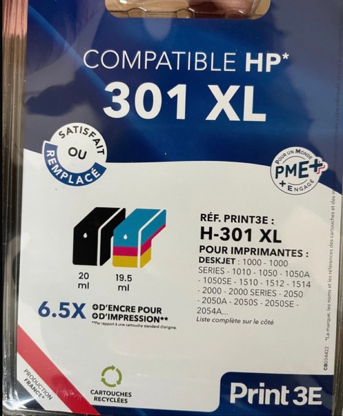 1 cartouche d’encre hp 301 xl noir 1 cartouche d’encre hp 301 xl couleur Compatible , neuf sous blister 20 euro les 2 cartouches prix ferme Envois mondial relay