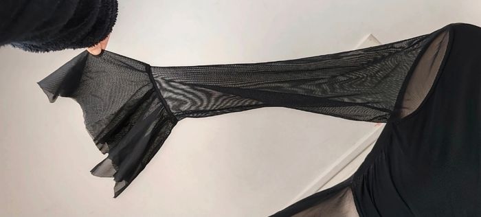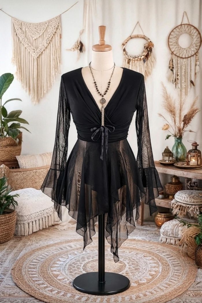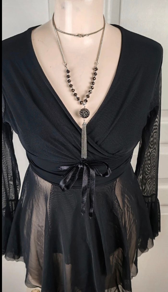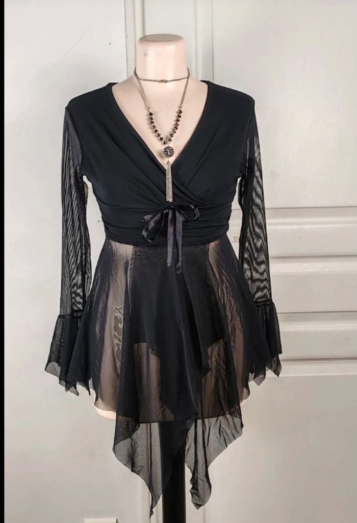 Haut Fluide Style Gothique / Romantique - Marque Parisienne 🖤 Description : Sublime haut noir de la marque Mona Baila Paris, fabriqué en France 🇫🇷. Un mélange parfait entre élégance sombre et style Y2K / Fairy Grunge. Détails coupe : Encolure en V croisée façon cache-cœur avec un petit nœud satiné à la taille qui souligne la silhouette. Manches : Manches longues en résille (mesh) transparente avec une finition évasée (manches cloches) pour un effet très dramatique. Bas : Juponnage en voile transparent asymétrique, fluide et léger. État : Excellent état, très peu porté. Taille : Indiqué Taille 3 (correspond plus à un M ou un 38/40 grâce à l'élasthanne qui le rend extensible et confortable). Parfait pour un look gothique chic, sorcière moderne (whimsigothic) ou pour une soirée ! 📮 Envoie rapide et soigner #gothic #goth #y2k #fairygrunge #whimsigoth #coquette #vintage #mesh #transparency #witchy #alternative #emo #cyber #manchescloches #frenchstyle #monabaila #blacktop #soirée #années2000 #retro #darkacademia