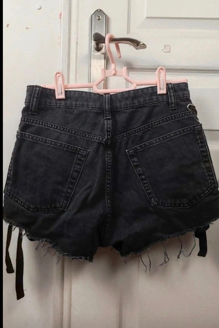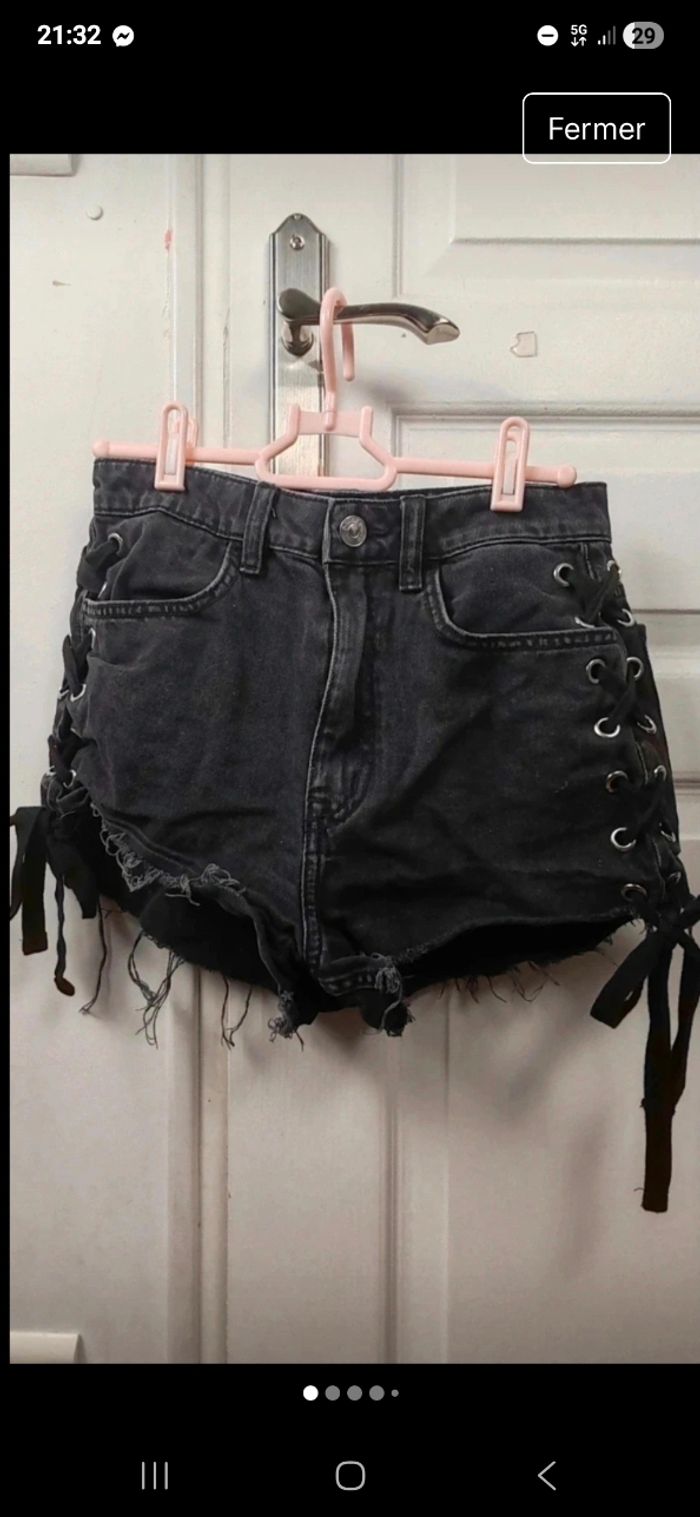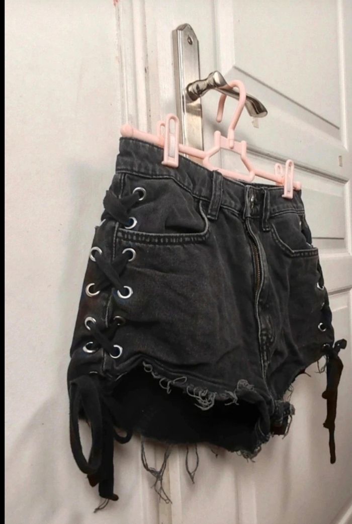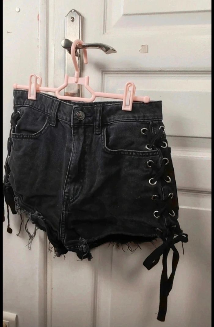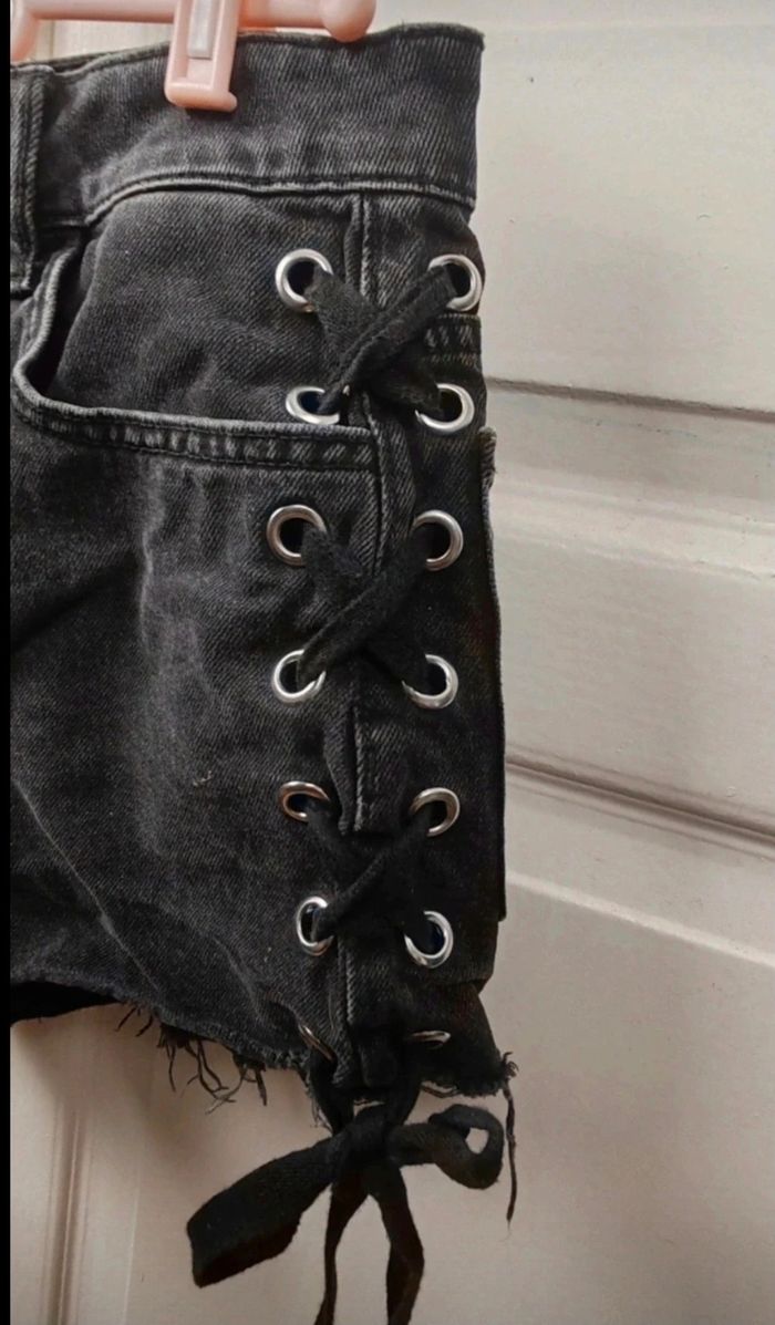 Short en Jean Noir Lacé - Style Goth / Y2K / Grunge Description : Je vends ce superbe short en jean noir délavé de chez H&M. C’est une pièce forte avec un style très affirmé, parfait pour compléter un look alternatif ! Détails stylés : Lacets croisés sur les côtés avec œillets métalliques et finitions effilochées/destroy sur le bas pour un effet grunge. Coupe : Taille haute, très flatteur pour la silhouette. État : Excellent état, Taille : 36 (S). Se référer à l'étiquette en photo : EUR 36 / US 4. Idéal avec des collants résille et des plateformes pour un total look Gothique, ou avec un crop top pour une vibe Y2K / Aesthetic. 📏 Informations complémentaires : Marque : H&M Taille : 36 (S) Couleur : Noir / Gris anthracite délavé Envoi : Rapide et soigné