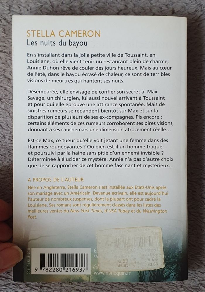 =) Thriller, suspense, disparitions, cauchemars, tueur, meutres, chaleur, mystère.. Résumé : En s'installant dans la jolie petite ville de Toussaint, en Louisiane, où elle vient tenir un restaurant plein de charme, Annie Duhon rêve de couler des jours heureux. Mais au coeur de l'été, dans le bayou écrasé de chaleur, ce sont de terribles visions de meurtres qui hantent ses nuits. Désemparée, elle envisage de confier son secret à Max Savage, un chirurgien, lui aussi nouvel arrivant à Toussaint et pour qui elle éprouve une attirance spontanée. Mais de sinistres rumeurs se répandent bientôt sur Max et sur la disparition de plusieurs de ses ex-compagnes. Pis encore : . Certains éléments de ces rumeurs corroborent ses pires visions, donnant à ses cauchemars une dimension atrocement réelle... Est-ce Max, ce tueur qu'elle voit jetant une femme dans des flammes rougeoyantes ?.. Ou bien est-il un homme traqué et poursuivi par la haine sans pitié d'un ennemi invisible ? Déterminée à élucider ce mystère, Annie n'a pas d'autre choix que de se rapprocher de cet homme fascinant et mystérieux... Date de parution : 01/01/2011. Auteur : Stella Cameron. Collection : Les Best-Sellers. Éditions : Harlequin. =) 439 pages. Montant d'achat magasin : 6.99E. En très bon état général! Juste de très légères traces d'usage sur couverture (minimes). L'intérieur du livre est nickel.