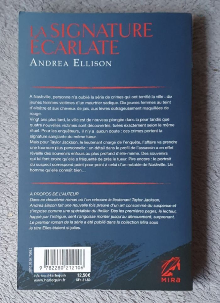 =) Second volet de la série des enquêtes du Lieutenant Taylor Jackson. =) Policier, polar, thriller, suspense, meurtres en série, enquête.. Résumé : A Nashville, personne n´a oublié la série de crimes qui ont terrifié la ville : Dix jeunes femmes victimes d´un meurtrier sadique. Dix jeunes femmes au teint d´albâtre et aux cheveux de jais, aux lèvres outrageusement maquillées de rouge. Vingt ans plus tard, la ville est de nouveau plongée dans la peur tandis que quatre nouvelles victimes sont découvertes, tuées exactement selon le même rituel. Pour les enquêteurs, il n´y a aucun doute : Ces crimes portent la signature sanglante du même tueur. Mais pour Taylor Jackson, le Lieutenant chargé de l´enquête, l´affaire va prendre une tournure plus personnelle : Un détail dans le profil de l´assassin a en effet réveillé des souvenirs enfouis au plus profond d´elle-même. Des souvenirs qui lui font croire qu´elle a fréquenté de près le tueur. Pire encore : Le portrait du suspect correspond point pour point à celui d´un notable de Nashville. Un homme qu´elle connaît bien... Dans ce deuxième roman où l’on retrouve le Lieutenant Taylor Jackson, Andrea Ellison fait une nouvelle fois preuve d’un art consommé du suspense et s’impose comme une spécialiste du thriller. Dès les premières pages, le lecteur, happé par l’intrigue, sent l’angoisse monter jusqu’au dénouement, surprenant. Le premier roman de la série a été publié dans la Collection Mira sous le titre "Elles étaient si jolies". Date de parution : 27/08/2010. Auteur : Andrea Ellison. Traductrice : Lucie Périneau. Collection : Mira. Éditions : Harlequin. Dimensions du livre : 14x22x2,5Cm. =) 439 pages. Montant d'achat magasin : 12.50E. En très bon état général! Juste de très légères traces d'usage sur couverture (à peine visibles). L'intérieur du livre est nickel!