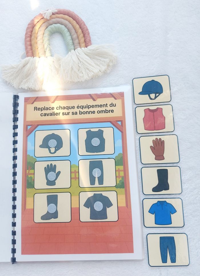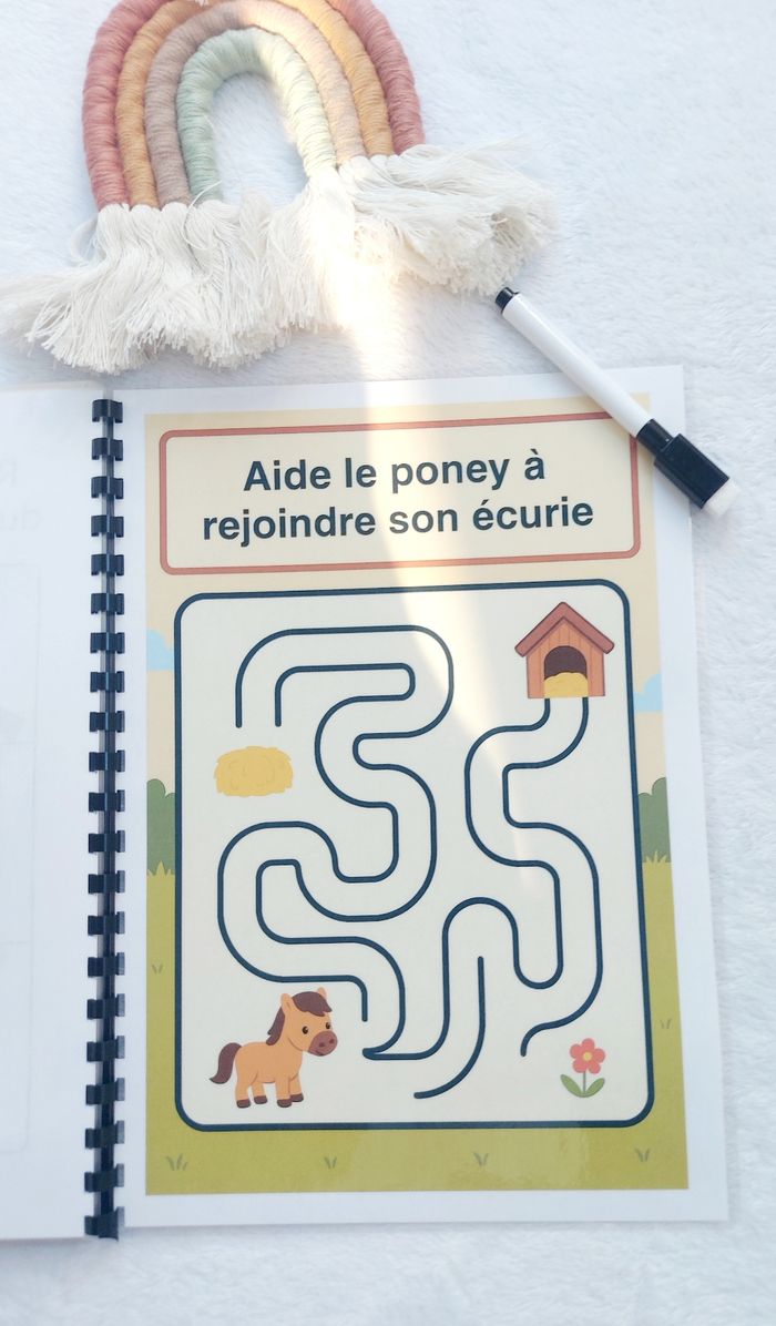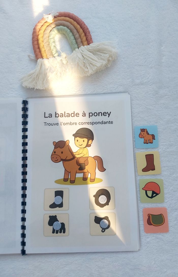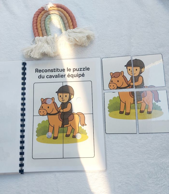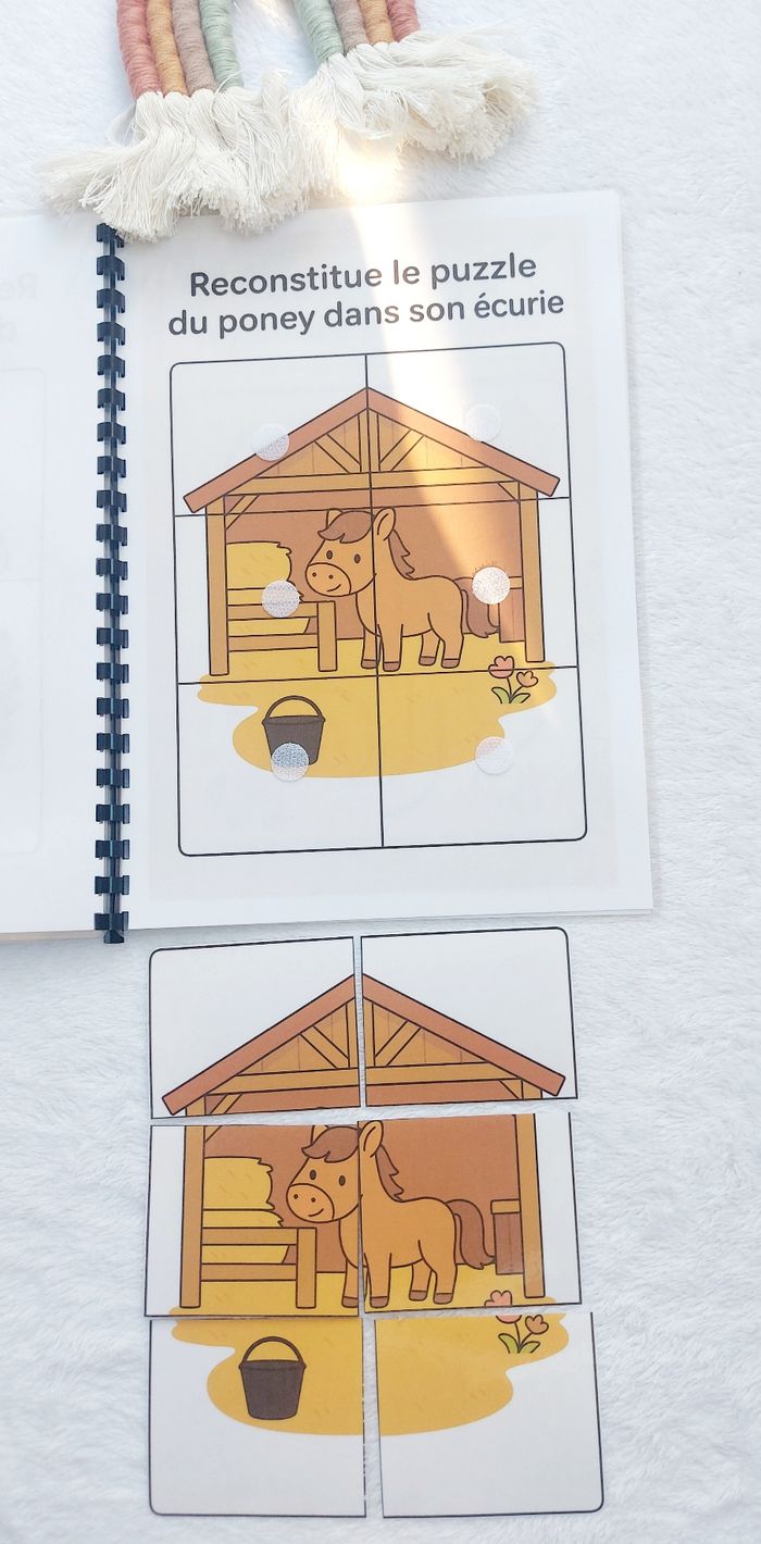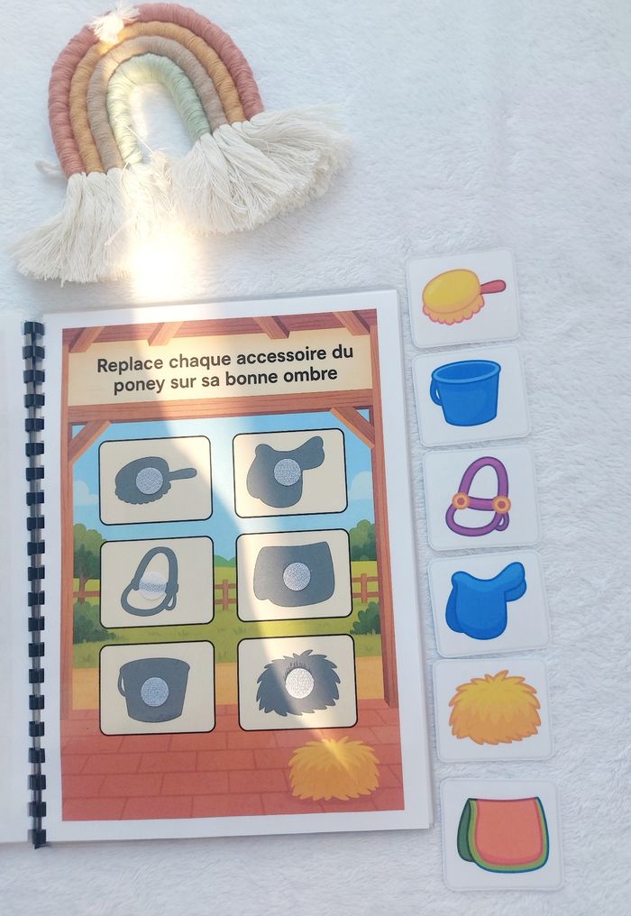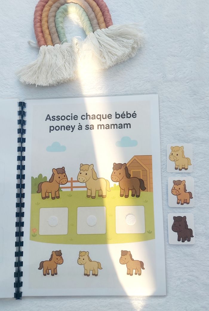 🐴 Livret d’activités – Pony Club 🌸 Dès 3 ans Un livret ludique et éducatif sur le thème du Pony Club, spécialement conçu pour les enfants dès 3 ans. À travers l’univers des chevaux et du centre équestre, votre enfant va apprendre en s’amusant grâce à des activités adaptées à son âge : ✔️ Associer et reconnaître ✔️ Observer les différences ✔️ Classer et trier ✔️ Développer la logique ✔️ Travailler la motricité fine ✨ Manipulation avec scratch ✨ Exercices simples et progressifs ✨ Pages plastifiées ✨ Utilisable au feutre effaçable (type Velleda) ✨ Réutilisable à l’infini Un support idéal pour apprendre tout en s’amusant, à la maison ou pendant les temps calmes. 📌 Création artisanale 📌 Fait avec soin 📌 Solide et durable ⚠️ Prix ferme – travail artisanal (impression, plastification et matériel inclus).