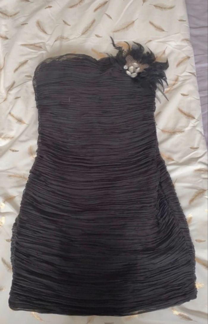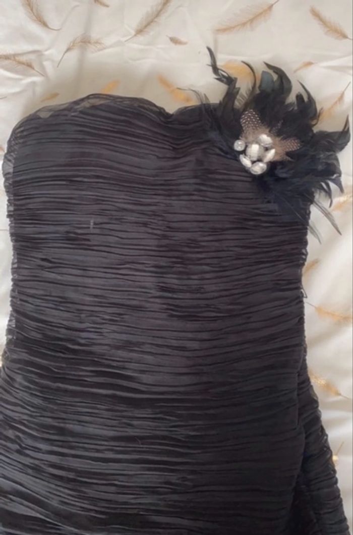 Cette robe est une petite robe noire courte, à la fois sophistiquée et texturée. Tenue typiquement cocktail ou soirée. 📐 taille 36 👗 Coupe : ajustée au corps 👗Encolure : Bustier droit (sans bretelles) 👗 Effet plissé 👗 Ornement : broche florale imposante située sur le côté gauche de la poitrine, le bijoux peut s’enlever