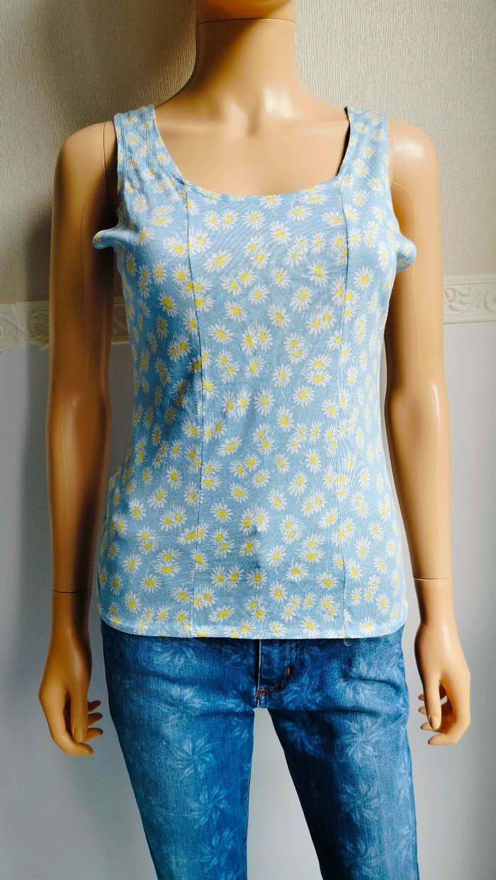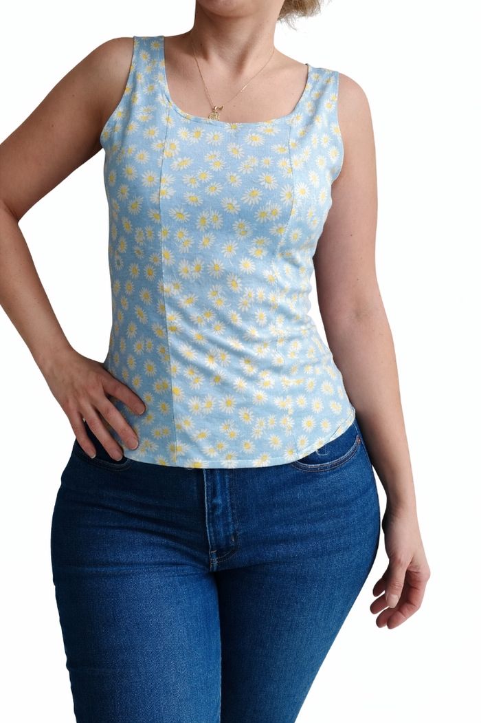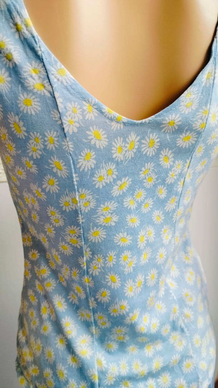 Débardeur fleuri de tournesol, vintage fait main bleu ciel/ blanc. De Taille 38. Cintré à la taille. En très bon état. H* 📏 Épaules : 32cm Aisselles : 41cm Longueur : 57cm #vendeurpro #marynlineshop78haut38 #vintage