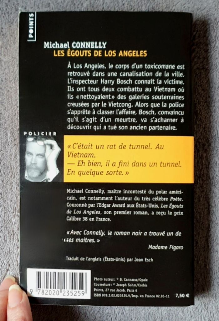 =) Roman Policier & polar, thriller, roman noir, suspense, fbi, enquêtes, Harry Bosch, braquage, meurtre, Los Angeles, guerre du Vietnam, États-Unis, littérature américaine.. =) Tome 1/26 des Enquêtes de l'Inspecteur Harry Bosch. Résumé : À Los Angeles, le corps d'un toxicomane est retrouvé dans une canalisation de la ville. L'inspecteur Harry Bosh connaît la victime. Ils ont tous deux combattu au Vietnam où ils "nettoyaient" des galeries souterraines creusées par le Vietcong. Alors que la police s'apprête à classer l'affaire, Bosh, convaincu qu'il s'agit d'un meurtre, va s'acharner à découvrir qui a tué son ancien partenaire.. Date de parution : 01/01/1998. Auteur : Michael Connelly. Traducteur : Jean Esch. Illustrateurs : Joseph Sohm & Corbis. Collection : Points. Éditions : Seuil. =) 460 pages. Montant d'achat magasin : 7.50E. En très bon état général. Juste de très légères traces d'usage sur couverture (minimes). L'intérieur du livre est nickel!