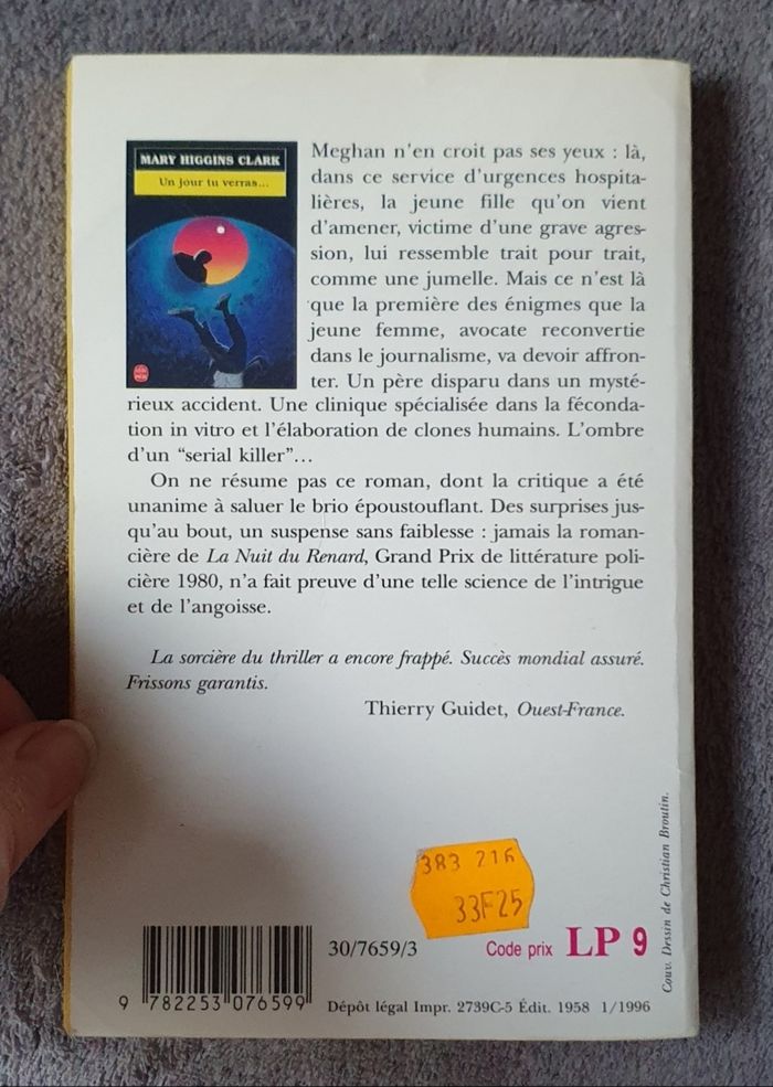 =) Roman policier & polar, thriller à suspense, thriller psychologique, manipulation, génétique, enquêtes, angoisse, médecine, meurtre, États-Unis, littérature américaine.. Résumé : Meghan n'en croit pas ses yeux : Là, dans ce service d'urgences hospitalières, la jeune fille qu'on vient d'amener, victime d'une grave agression, lui ressemble trait pour trait, comme une jumelle. Mais ce n'est là que la première des énigmes que la jeune femme, Avocate reconvertie dans le journalisme, va devoir affronter. Un père disparu dans un mystérieux accident. Une clinique spécialisée dans la fécondation in vitro et l'élaboration de clones humains. L'ombre d'un «serial killer»... On ne résume pas ce roman dont la critique a été unanime à saluer le brio époustouflant. Des surprises jusqu'au bout, un suspense sans faiblesse : Jamais la romancière de La Nuit du renard, Grand Prix de littérature policière 1980, n'a fait preuve d'une telle science de l'intrigue et de l'angoisse.. Année de parution : 1998. Auteur : M. Higgins Clark. Illustrateur : Christian Broutin. Éditions : Le Livre de Poche. =) 317 pages. En très bon état général. Juste de très légères traces d'usage sur couverture (minimes). L'intérieur du livre est nickel!