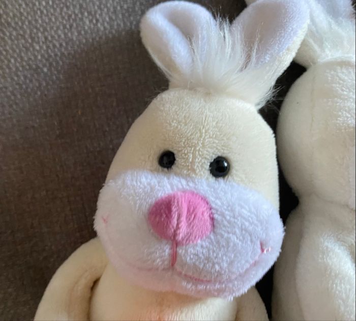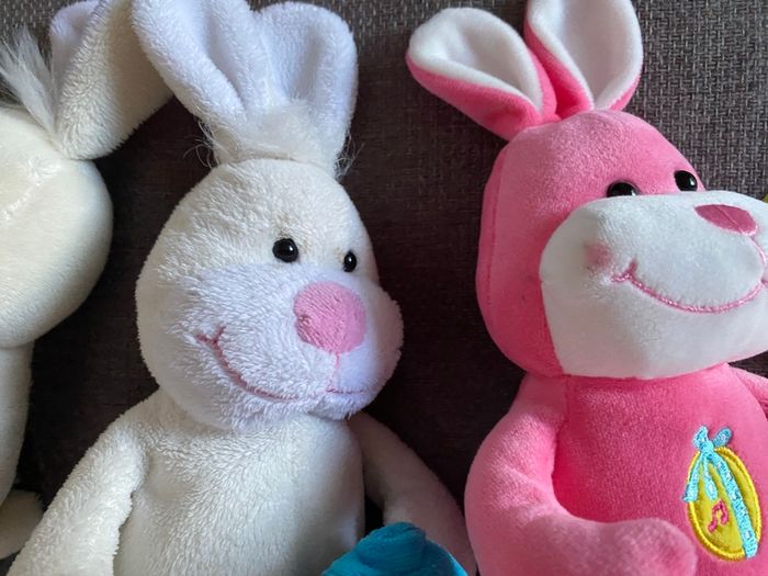 Lot de 3 peluches lapins de Pâques Il n’y a que celui qui a la cloche où le son fonctionne Ils font environ 20 cm de haut Vous achetez ce que vous voyez sur les photos