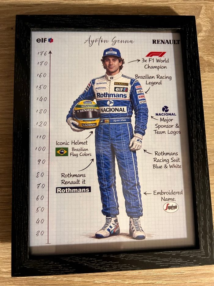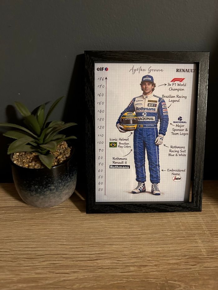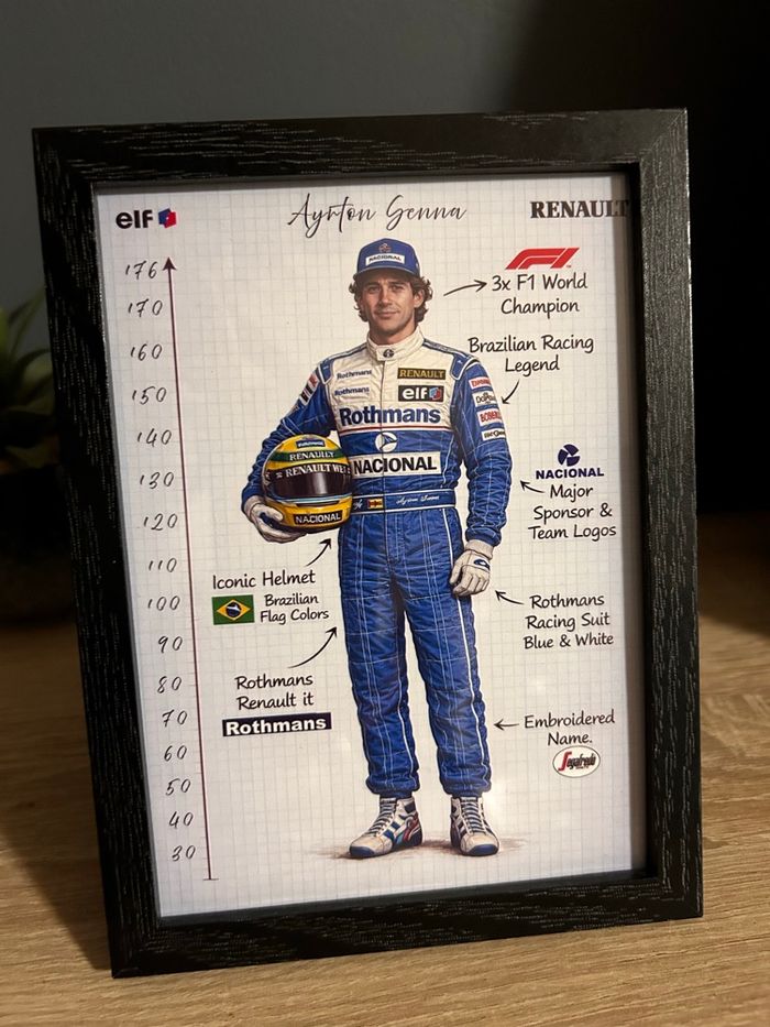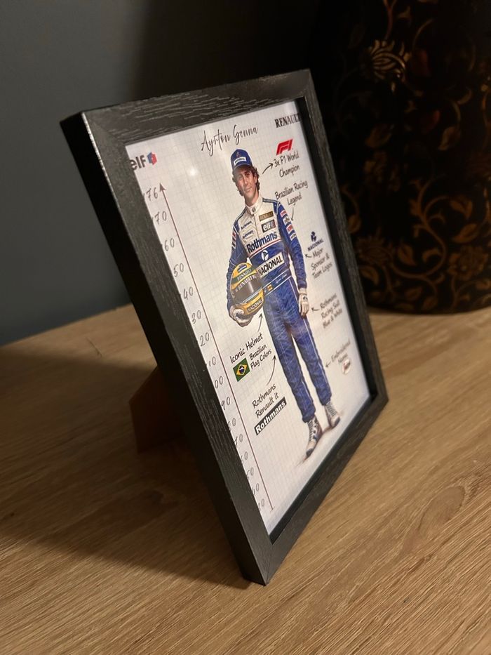 Cadre décoratif 13 x 18 cm, cadre en bois noir, représentant Ayrton Senna à l’époque Renault / Rothmans. Illustration de style croquis technique, avec annotations visuelles et références à sa carrière en Formule 1. Objet décoratif sobre et élégant, idéal pour un bureau, une étagère ou une collection liée au sport automobile et à la F1. • Format : 13 x 18 cm • Cadre : bois noir • État : Neuf