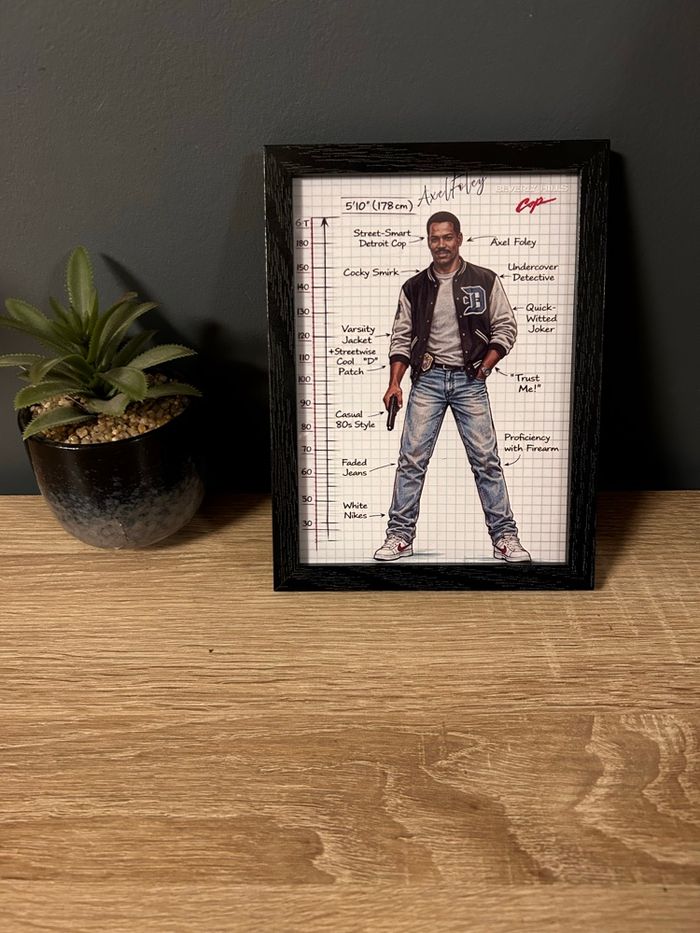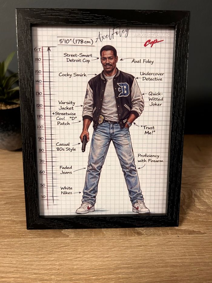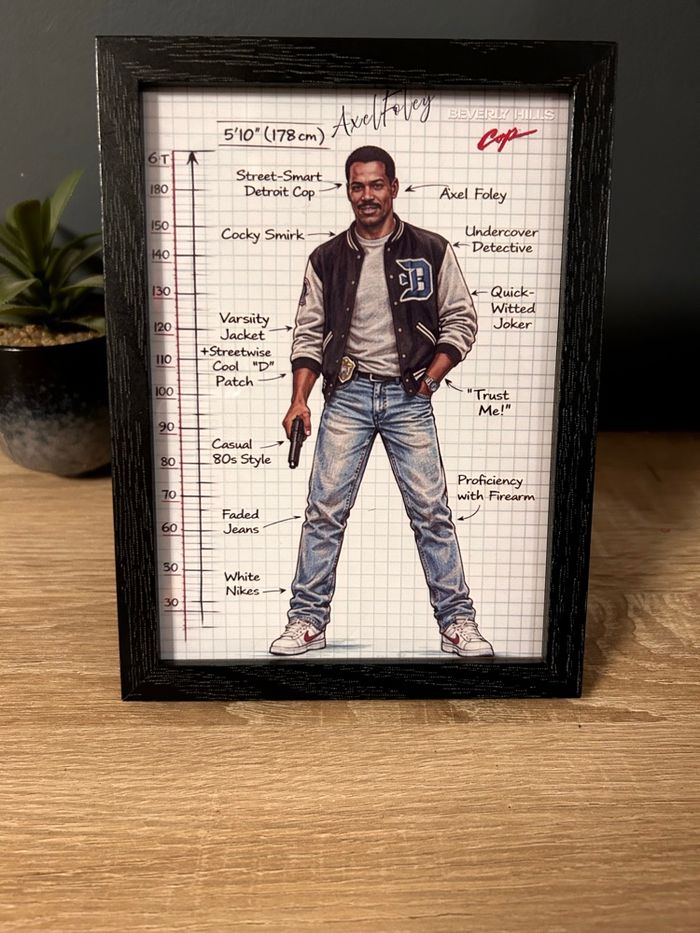 Cadre décoratif représentant Axel Foley, personnage culte du film Un flic à Beverly Hills. Illustration au style carnet technique / croquis, avec annotations et détails emblématiques des années 80. Caractéristiques : • 📐 Format : 13 x 18 cm • 🖼️ Cadre : bois noir • 📄 Illustration imprimée sur papier de qualité • 🎞️ Thème : cinéma / années 80 • 🏠 Prêt à poser (support arrière intégré) Idéal pour : • décoration de bureau, salon, chambre ou coin gaming • amateurs de cinéma culte et de pop culture • collectionneurs d’objets rétro / années 80 État : Neuf Envoi soigné et rapide 📦