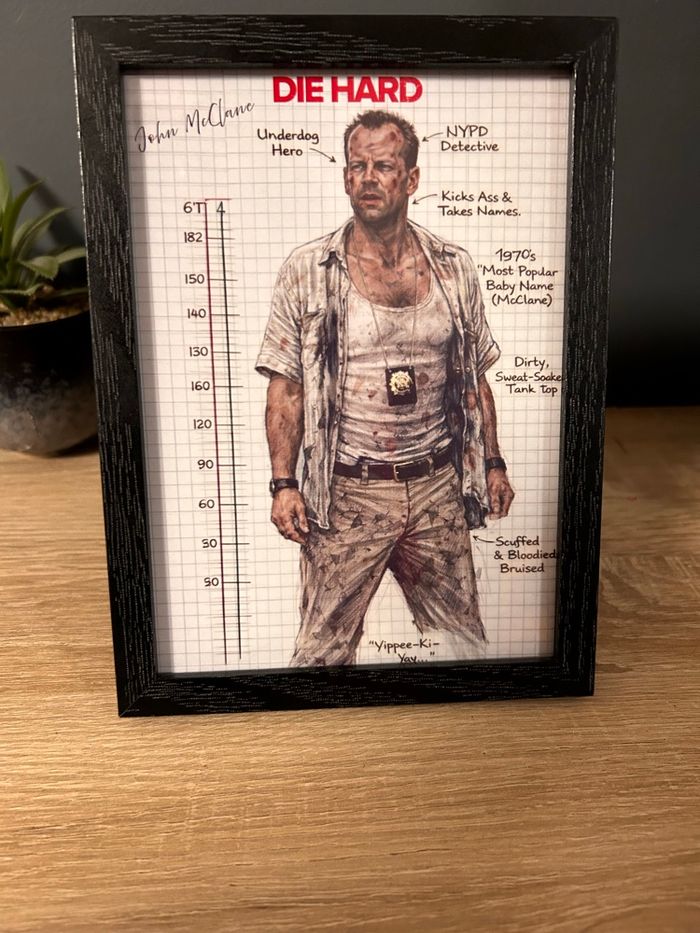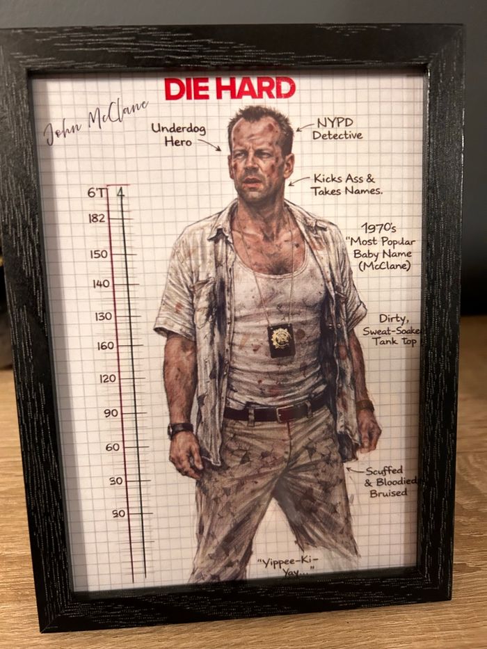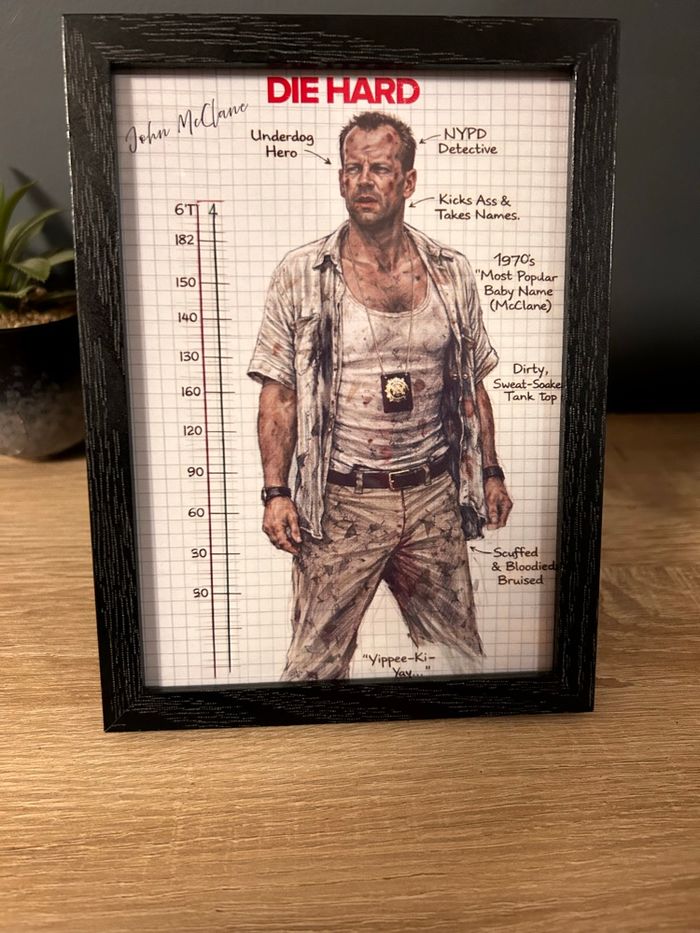 Yippee-Ki-Yay 💥 Si tu reconnais ce gars torse sale, pieds en vrac et regard vénère… 👉 oui, c’est John McClane, le flic le plus malchanceux de Noël 🎄🔫 🖼️ Cadre bois noir – format 13×18 🎬 Illustration style croquis technique / carnet 🔥 Film culte Die Hard (Piège de Cristal) 💣 Héros sous pression, sueur, sang et mauvaise humeur inclus 🏠 Parfait pour déco geek, ciné, bureau ou étagère qui a du caractère État : très bon Accroche murale au dos Aucun terroriste allemand fourni avec ❌ 👉 Idéal pour fans de cinéma, pop culture, années 80 👉 Cadeau parfait pour quelqu’un qui aime les héros qui prennent cher 📦 Envoi soigné 💬 Questions bienvenues
