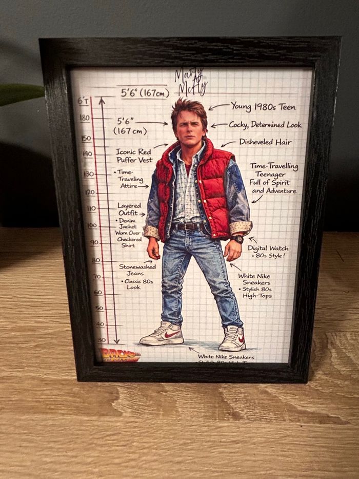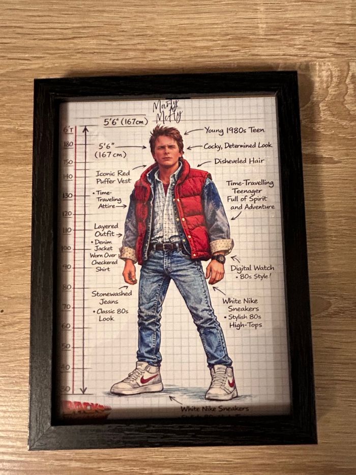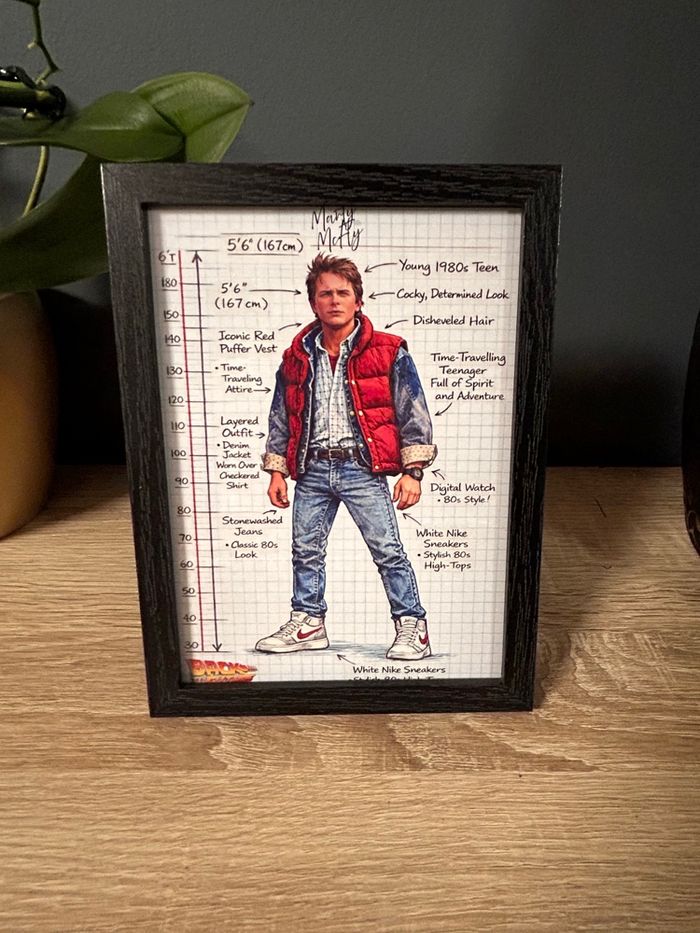 Cadre décoratif Marty McFly, personnage culte de Marty McFly dans Retour vers le futur. Illustration au style croquis technique rétro, avec annotations détaillées et esthétique carnet de designer. 🖼️ Détails : • Format : 13 × 18 cm • Cadre : bois noir • Illustration imprimée sur papier de qualité • Protection frontale (cadre prêt à poser ou accrocher) • Thématique : cinéma culte, années 80, science-fiction ✨ Pièce idéale pour une collection rétro, une déco gaming / pop culture ou un cadeau original pour fans de films cultes. 📦 Envoi soigné et rapide. 📩 N’hésite pas à me contacter pour un lot ou d’autres personnages disponibles.