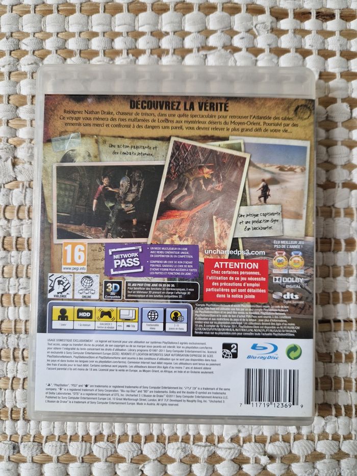 🎮 Jeu vidéo PS3 - Uncharted 3 : L'Illusion de Drake 🌍 ✨ Description : Plongez dans une aventure épique avec Nathan Drake dans "Uncharted 3 : L'Illusion de Drake" sur PlayStation 3 ! Ce jeu vous propose un gameplay dynamique, une histoire passionnante et des graphismes incroyables. Suivez Drake à travers des décors spectaculaires et des énigmes intrigantes, tout en vivant des scènes d’action à couper le souffle. Le jeu inclut également un mode multijoueur pour des heures de fun entre amis ! 🎮🔥 📦 État : Occasion, en très bon état. La boîte, la jaquette et le disque sont en bon état, avec quelques légers signes d'usure sur le plastique (voir photo). Aucun défaut majeur. 👍 🌟 Caractéristiques : Jeu en français Compatible 3D Pegi 16 Développé par Naughty Dog Mode multijoueur en ligne 🎮✨ ⚠️S'agissant d'un produit d'occasion, tout bonus, contenu exclusif ou extension de la version neuve ne sera pas garanti N’hésitez pas à me contacter pour plus de photos ou d’informations ! 😊
