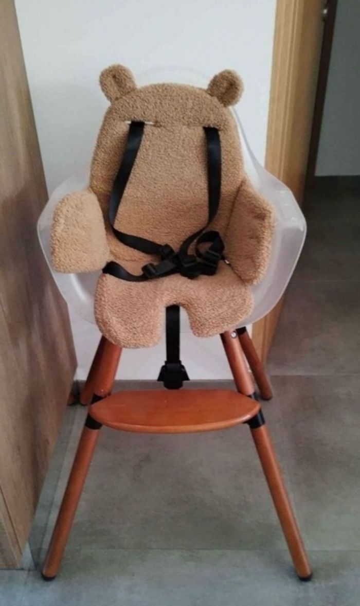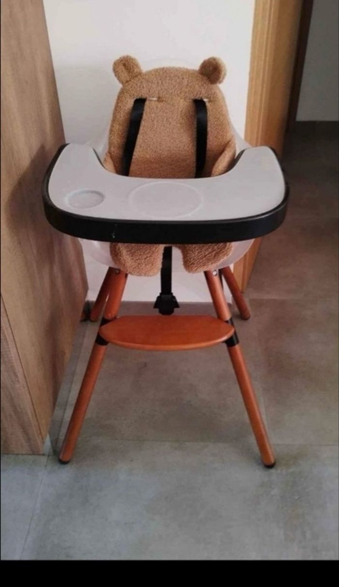 Chaise Evolu childhome Complète avec tablette + tapis silicone et réducteur ourson. La chaise est en bois et l'assise transparente. Valeur neuve de la chaise 25o € + grands pieds 57€ Vendu 130 euros Possibilité de reduire la chaise haute en petite chaise ou de rajouter les grands pieds pour une chaise de bar.