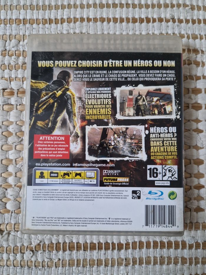 🔥 Vends jeu inFAMOUS pour PlayStation 3 🔥 Plongez dans l'univers électrique de Cole MacGrath, un héros devenu anti-héros, avec des pouvoirs dévastateurs ! Parfait pour les amateurs de jeux d’action-aventure, de super-héros et d’histoire palpitante ! 🕹️ Détails du jeu : Plateforme : PlayStation 3 Genre : Action / Aventure Âge recommandé : 16+ (PEGI) État : Bon état Contenu : Jeu avec la boîte et le manuel 📚 ⚠️S'agissant d'un produit d'occasion, tout bonus, contenu exclusif ou extension de la version neuve ne sera pas garanti Envoi rapide et soigné 📦 N hésitez pas à voir mes autres articles car je fais du vide dans mes placards 🌸