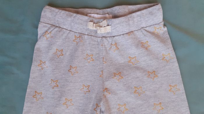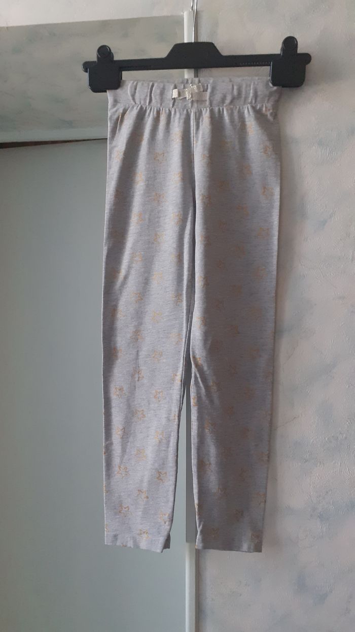 Vends un legging en coton et polyester, ceinture élastique avec lien, couleur gris avec étoiles dorées, marque Harry Potter, taille 8 ans sur l'étiquette mais étroit à la ceinture, 7 ans. Longueur entrejambe : 48 cm.