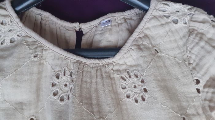 Vends une robe manches longues 100 % coton fin, doublée, petits volants aux poignets, couleur beige uni, marque Zeeman, taille 122/128 sur l'étiquette, 7 ans. Longueur de l'épaule à la base : 62 cm.