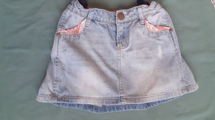 Vends une jupe en jean délavé, 100 % coton, taille ajustable, couleur bleu, marque IKKS, taille 8 ans. Longueur : 27 cm.