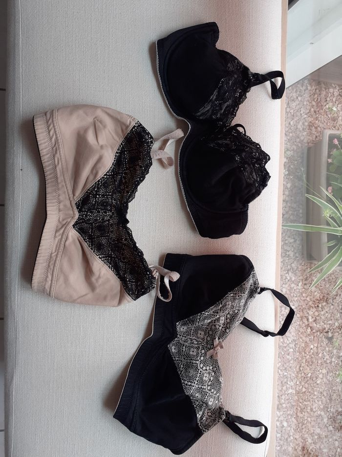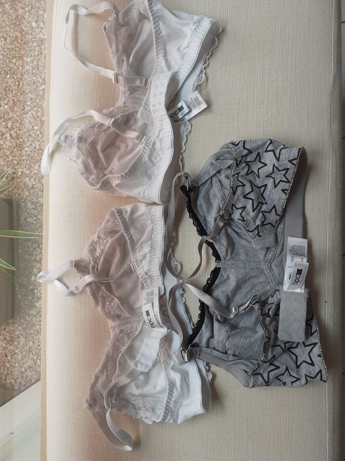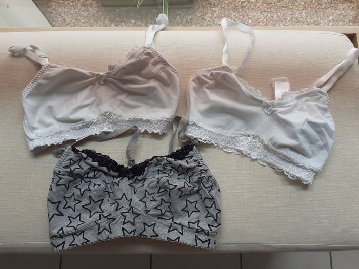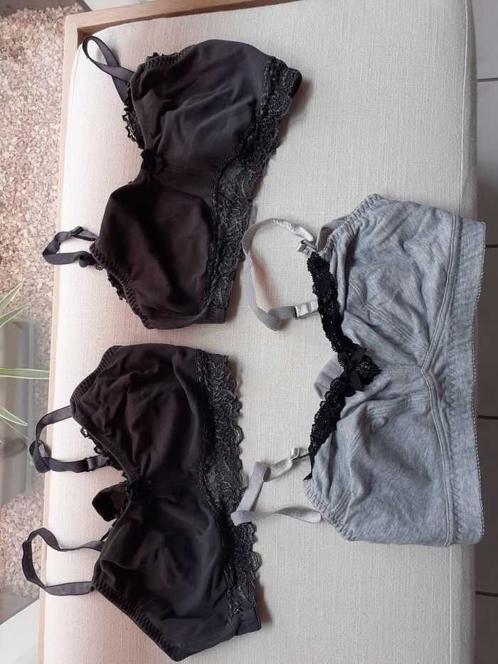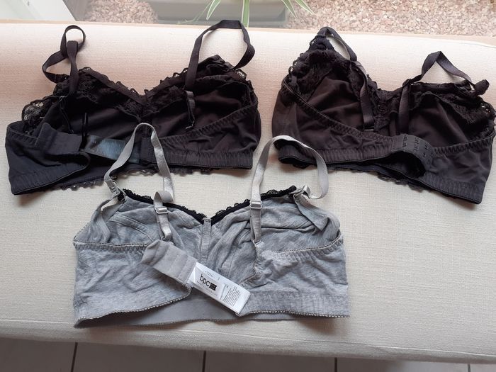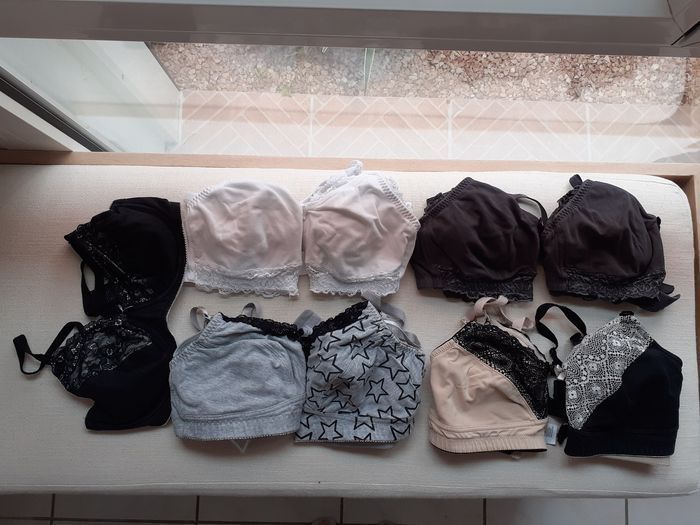 Lot de 9 soutiens-gorge d'allaitement sans rembourrage. Couleurs : 2 noirs, 2 gris foncés, 2 gris clairs, 2 blancs et 1 beige. Marque: Bonprix Taille Fr: 90C Excellent maintien de la poitrine. Le tout en très bon état.