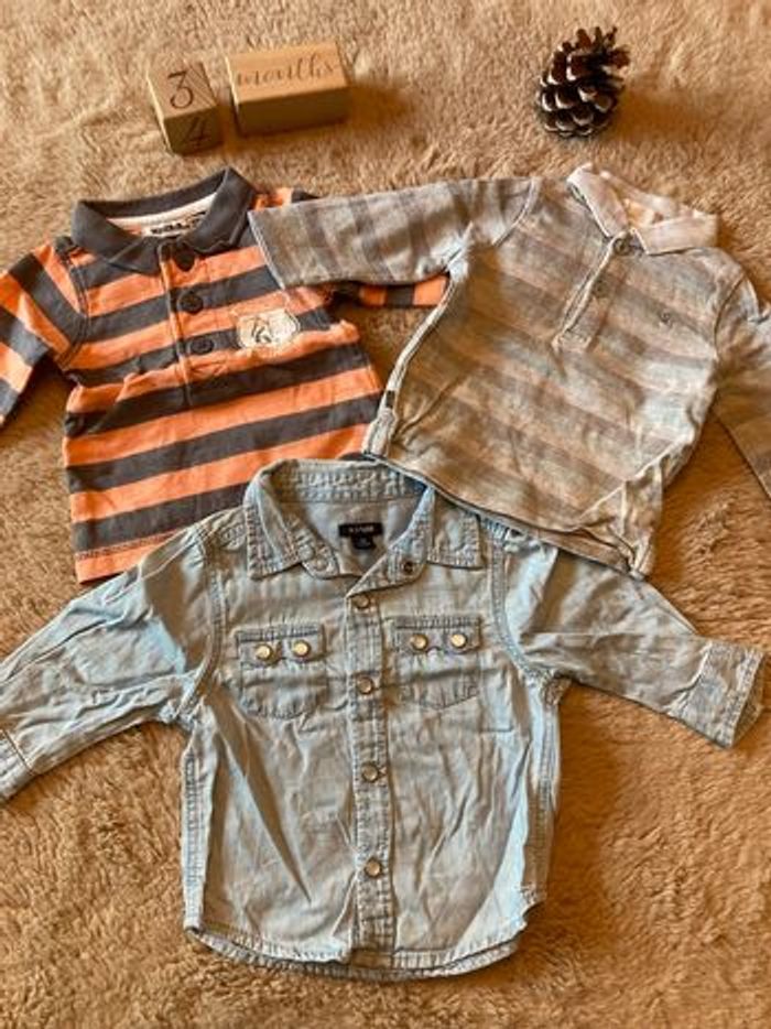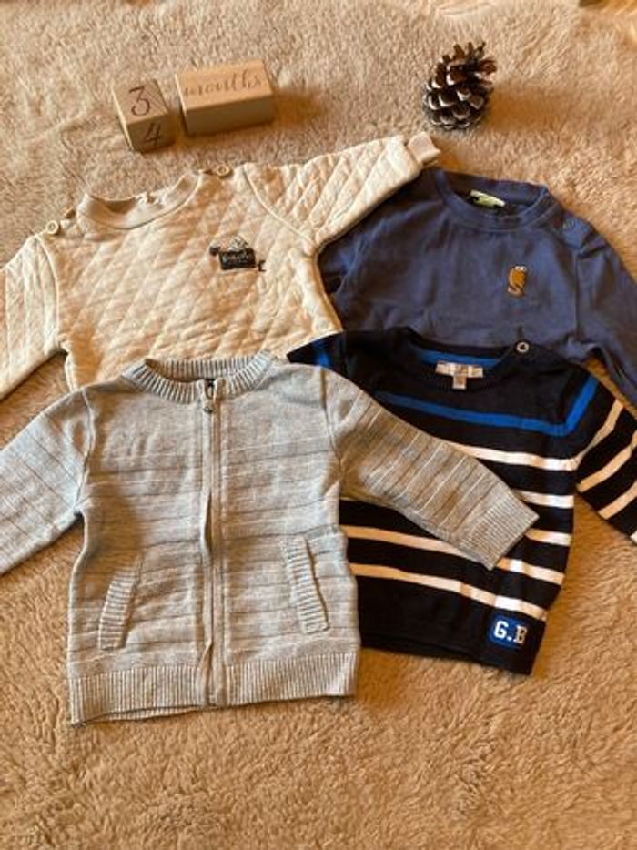Lot composé de 3 chemises ML, 4 pantalons, 4 pulls, 2 ensemble, une salopette, 3 pyjamas chauds Taille 3 mois Le tout en parfait état Marques diverses: Kiabi, tao…