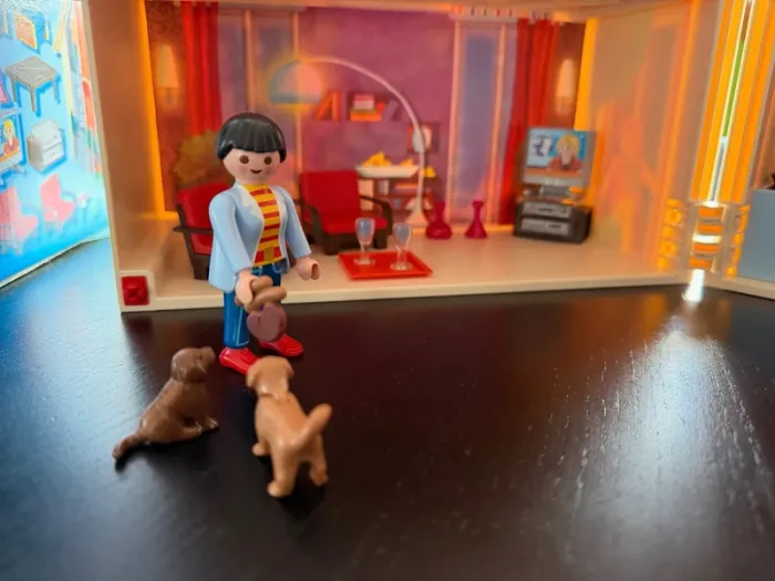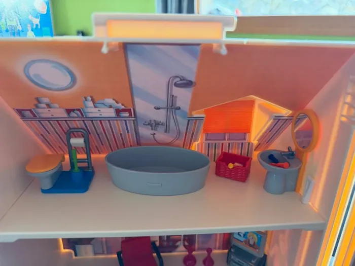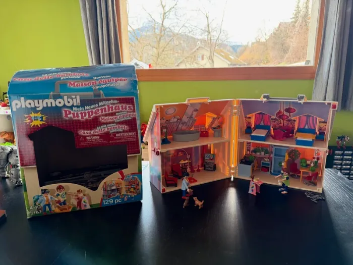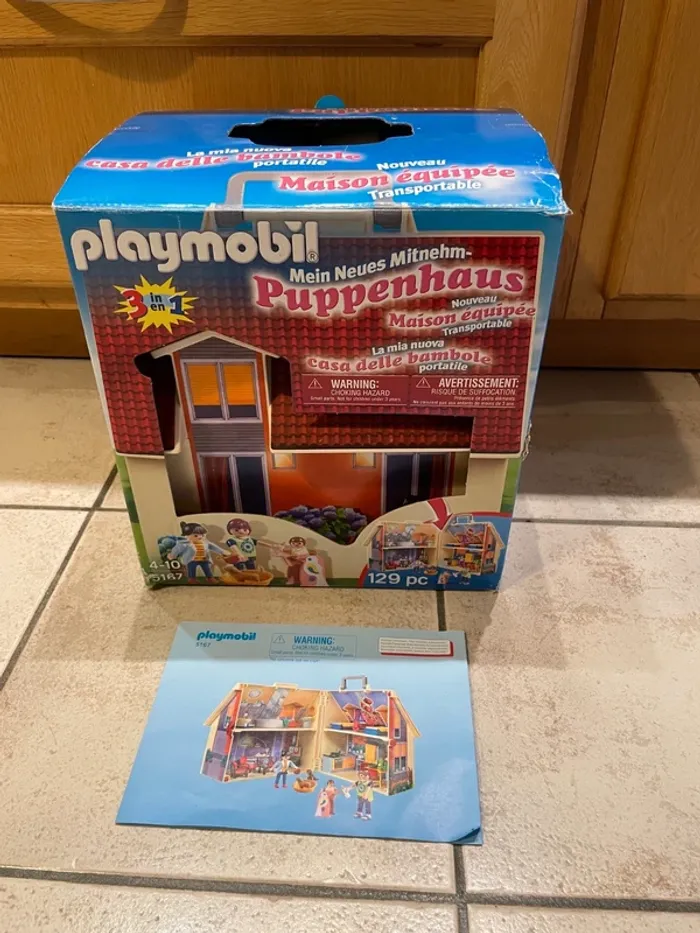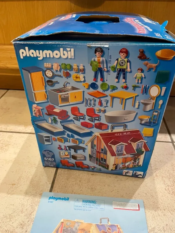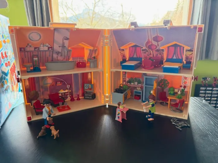 Maison Playmobil transportable, super pour emmener partout, tout se range à l'intérieur. Avec la boite d'origine (boite légèrement abimée) et sa notice. Il manque quelques pièces qui ne sont vraiment pas essentielles au jeu: Il manque les petites serviettes (c'était des petits bouts de tissus, pas des pièces en plastique), il manque une tong à un personnage, un sèche cheveux et un petit panier jaune.