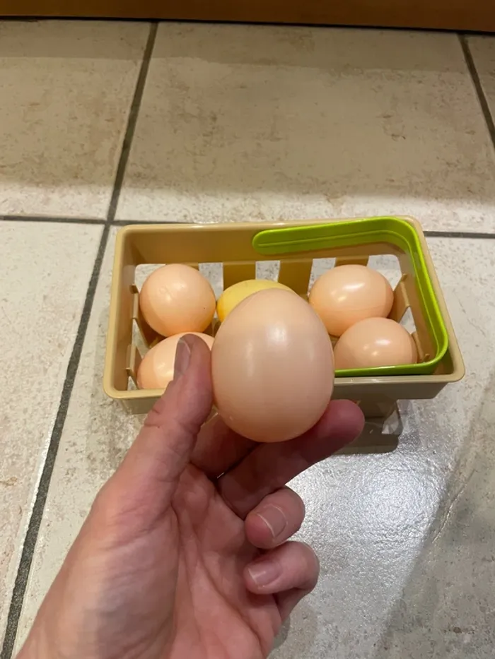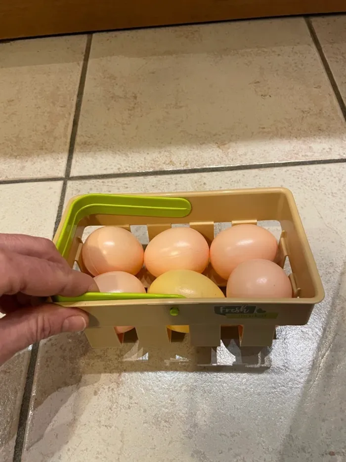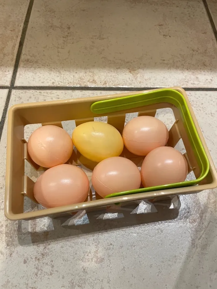 Jouets pour dinettes 6 œufs en plastique Super bien imités, on dirait de vrais ;) Avec le panier montré en photo.