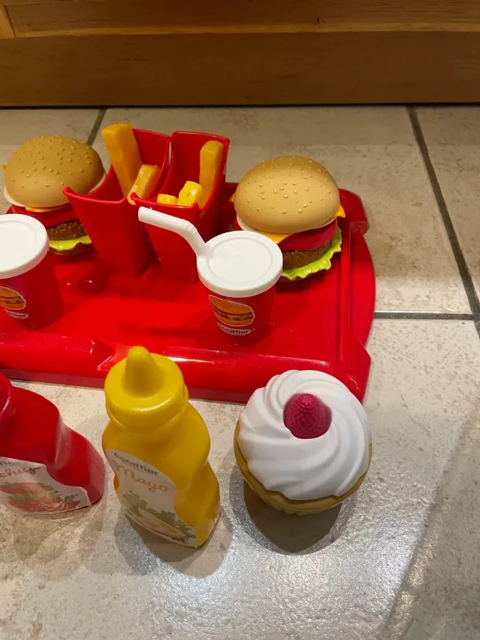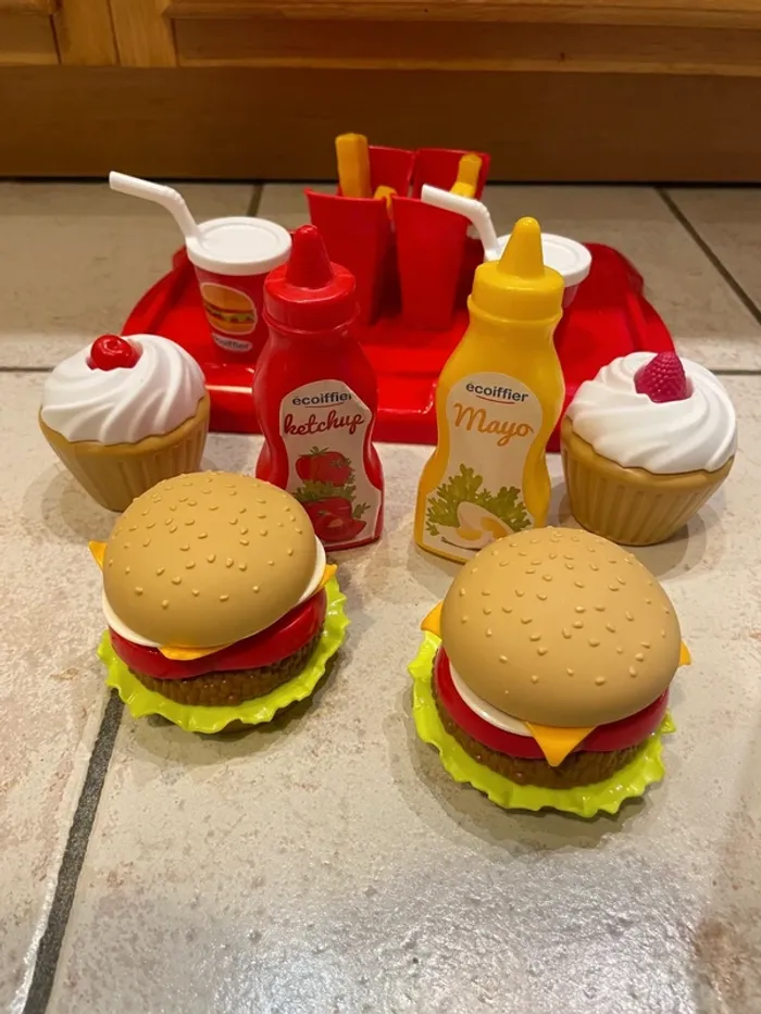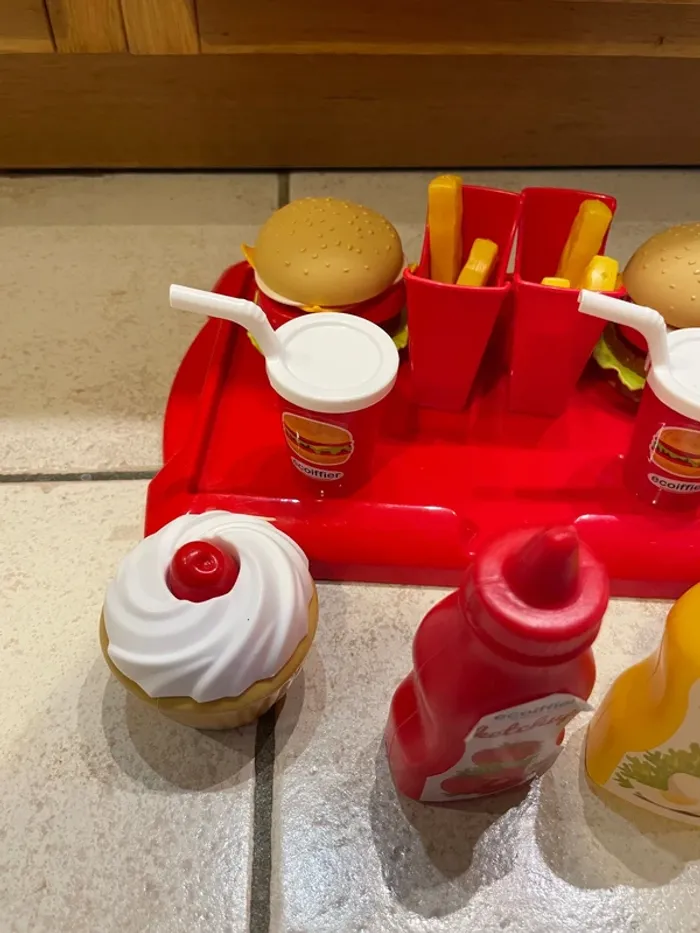 Petit plateau composé de 2 hamburgers, 2 portions de frites, 2 boissons et 2 dessert. Il y a aussi 2 bouteilles de sauce. En plastique. Marque Ecoiffier Vendu tel que sur les photos.