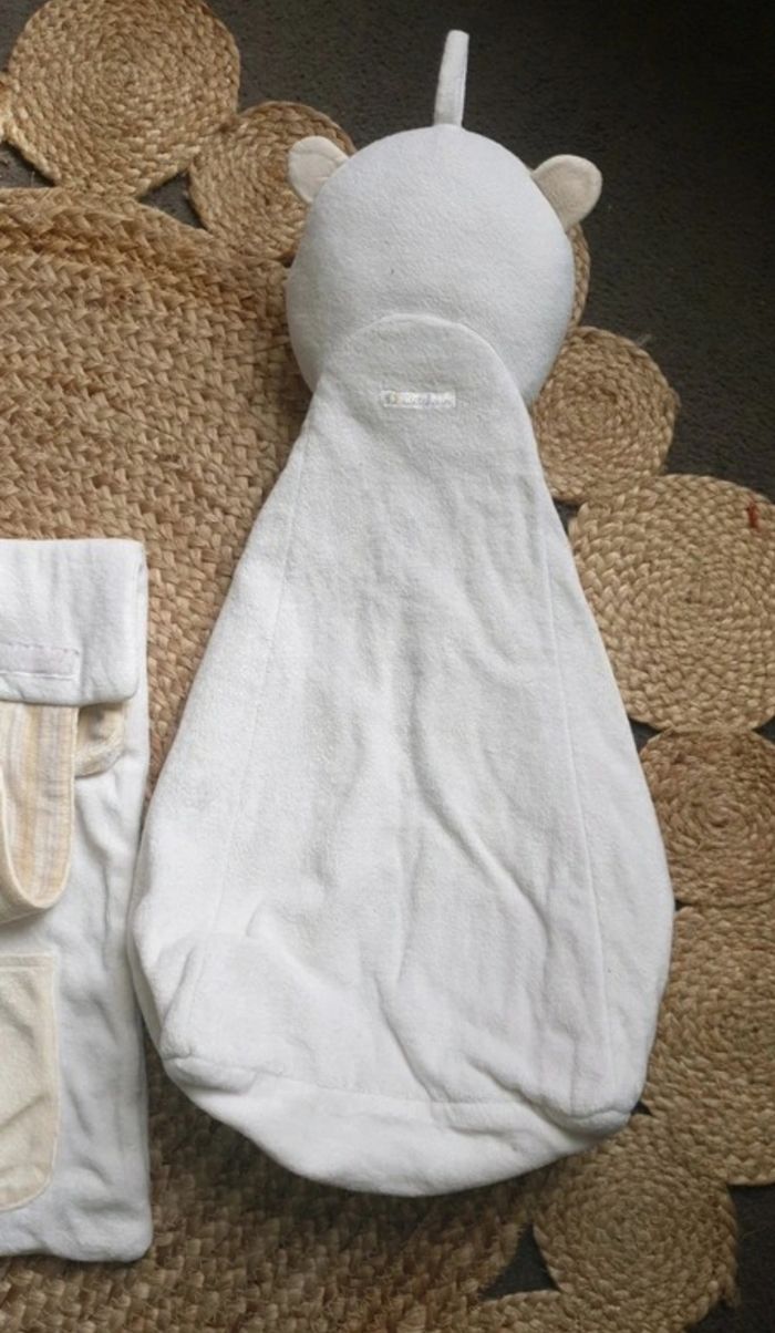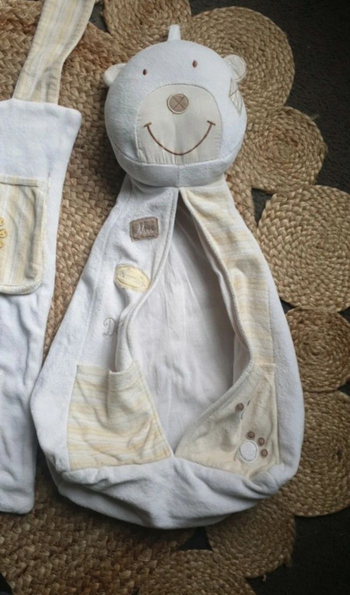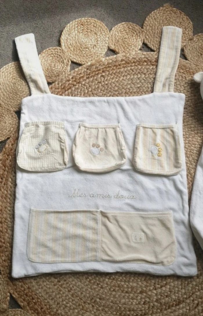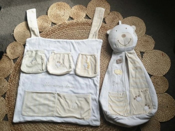 Très utile dans la chambre de bébé. Le petit nounourse j'utilisai pour ranger les couches du bébé. Pour l'organiseur on peut y mettre toute choses utiles. Il s'accroche sur le lit. En excellent état idéal cadeau de naissance.