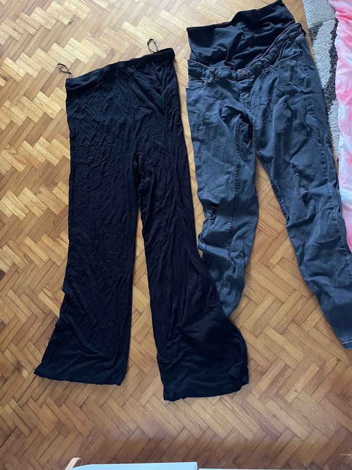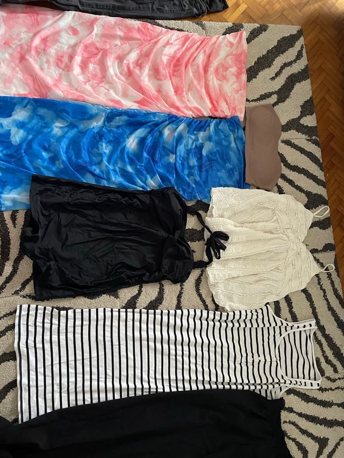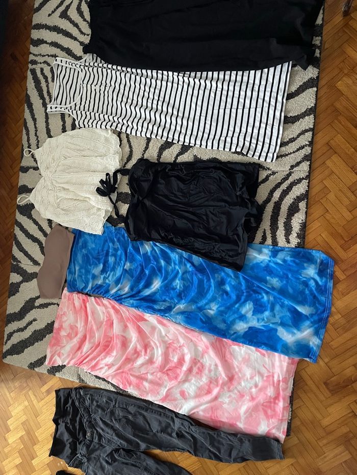 Vêtements d’été de grossesse 4 robes laissant la place au jolie ventre de grossesse dont une perroquet pour l’allaitement j’ai également mis un soutien gorge bustier pour les deux robes rose et bleu taille L le reste est en taille 38 ou 40 un jolie pantalon noir large léger parfait pour l’été, un pantalon chill très large très léger ainsi qu’un jean de grossesse gris foncé la robe à rayures est de kiabi rayon grossesse un jolie top blanc cassé il y’a aussi un maillot de bain une pièce de grossesse je fait un lot après si des articles ne vous intéresse pas vous pouvez m’envoyer un message