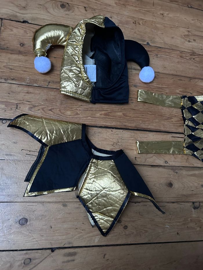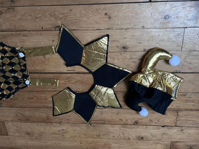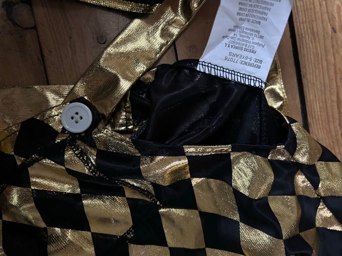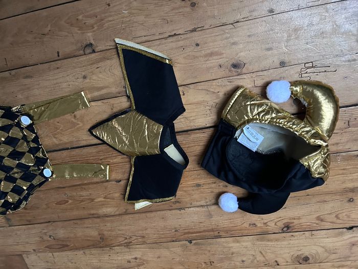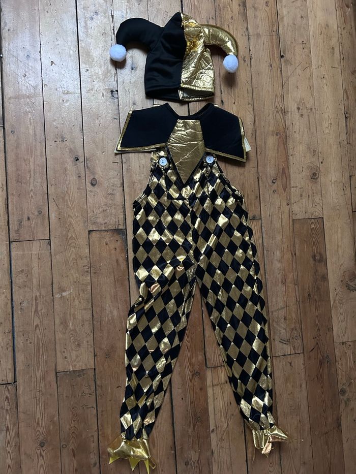 Déguisement arlequin joker Noir et doré Taille 5-6 ans Col Collerette chapeau salopette Mardi gras carnaval