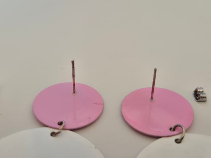 Boucles d'oreilles fantaisie. Etat correct, quelques traces d'usure (voir photos). Coloris = rose & blanc. Les deux fermoirs sont différents. Longueur = 5,5cm environ. N'hésitez pas à me contacter si vous avez des questions. Je vous répondrai dès que possible.